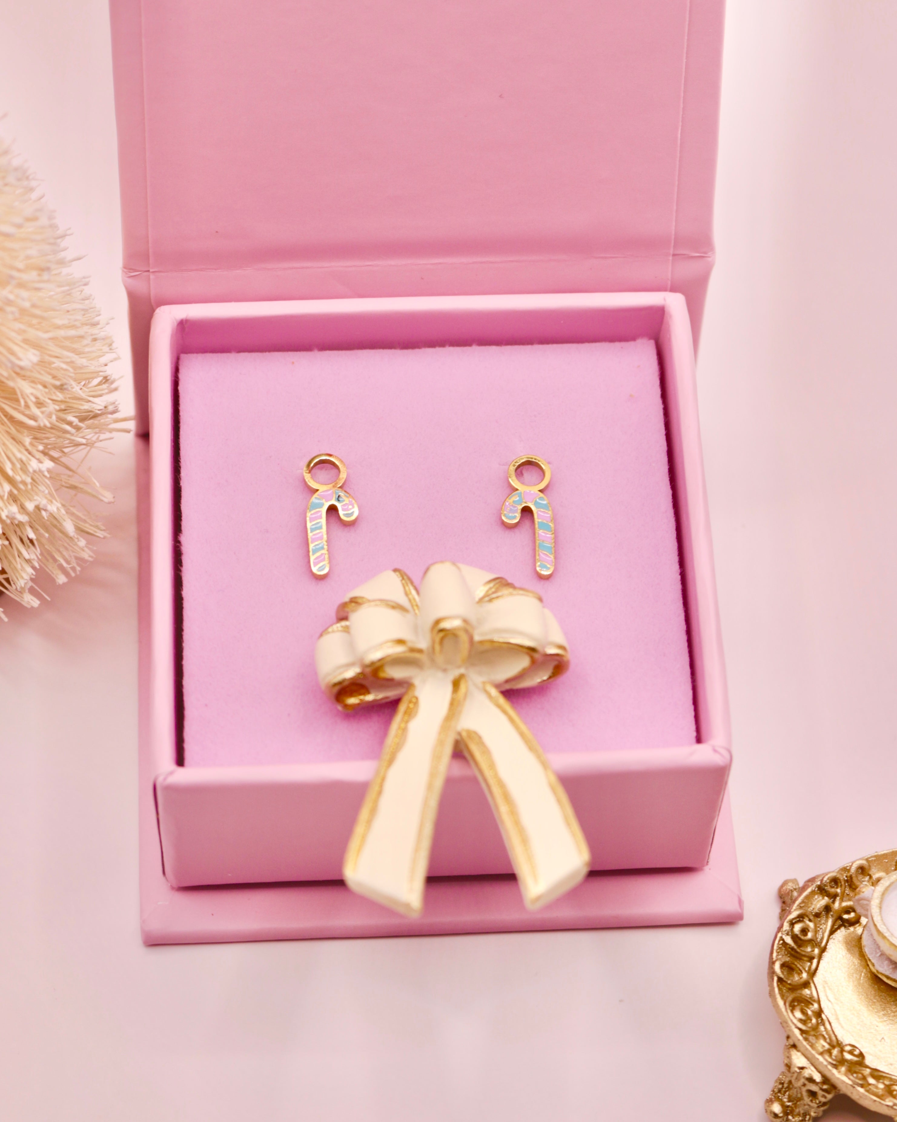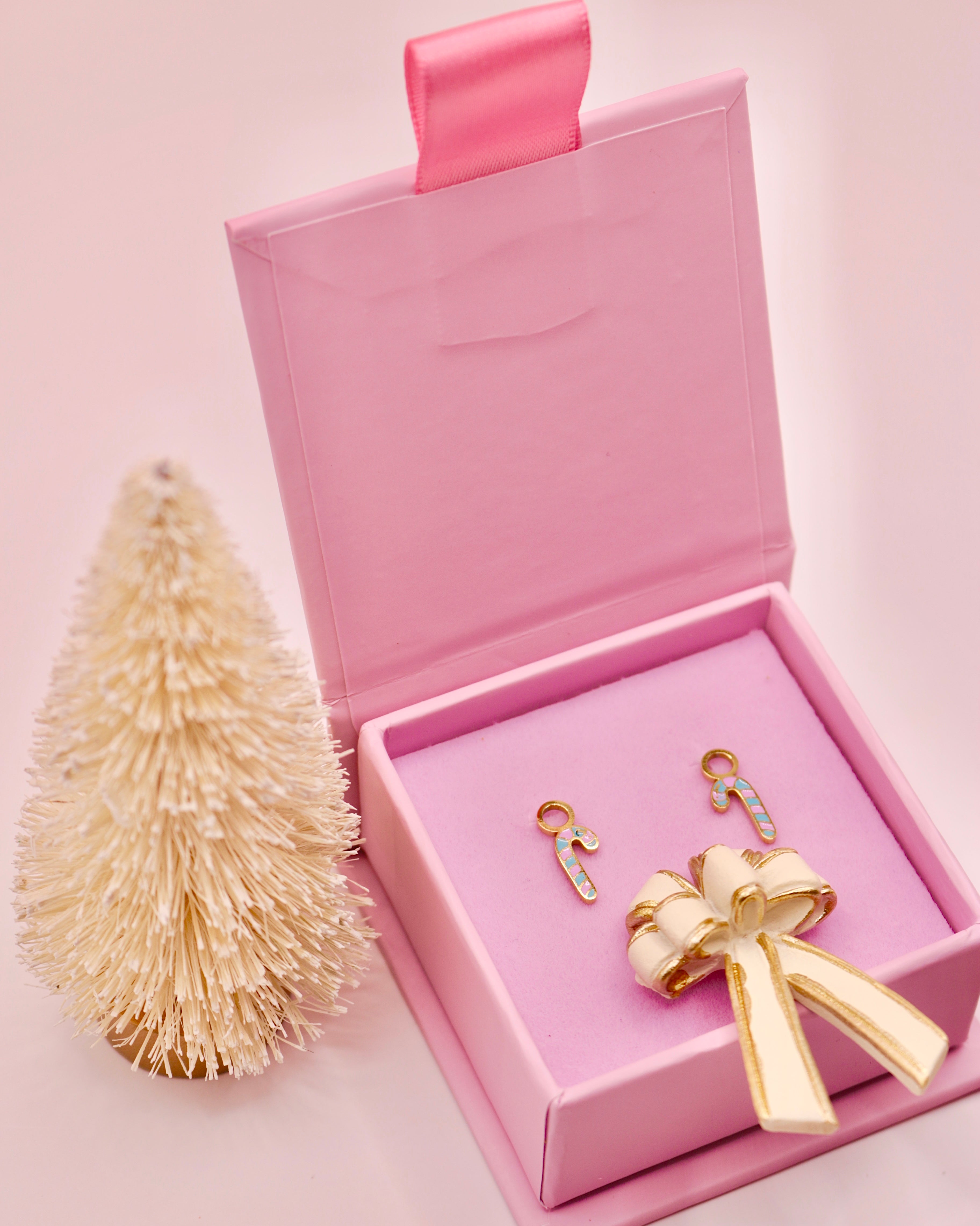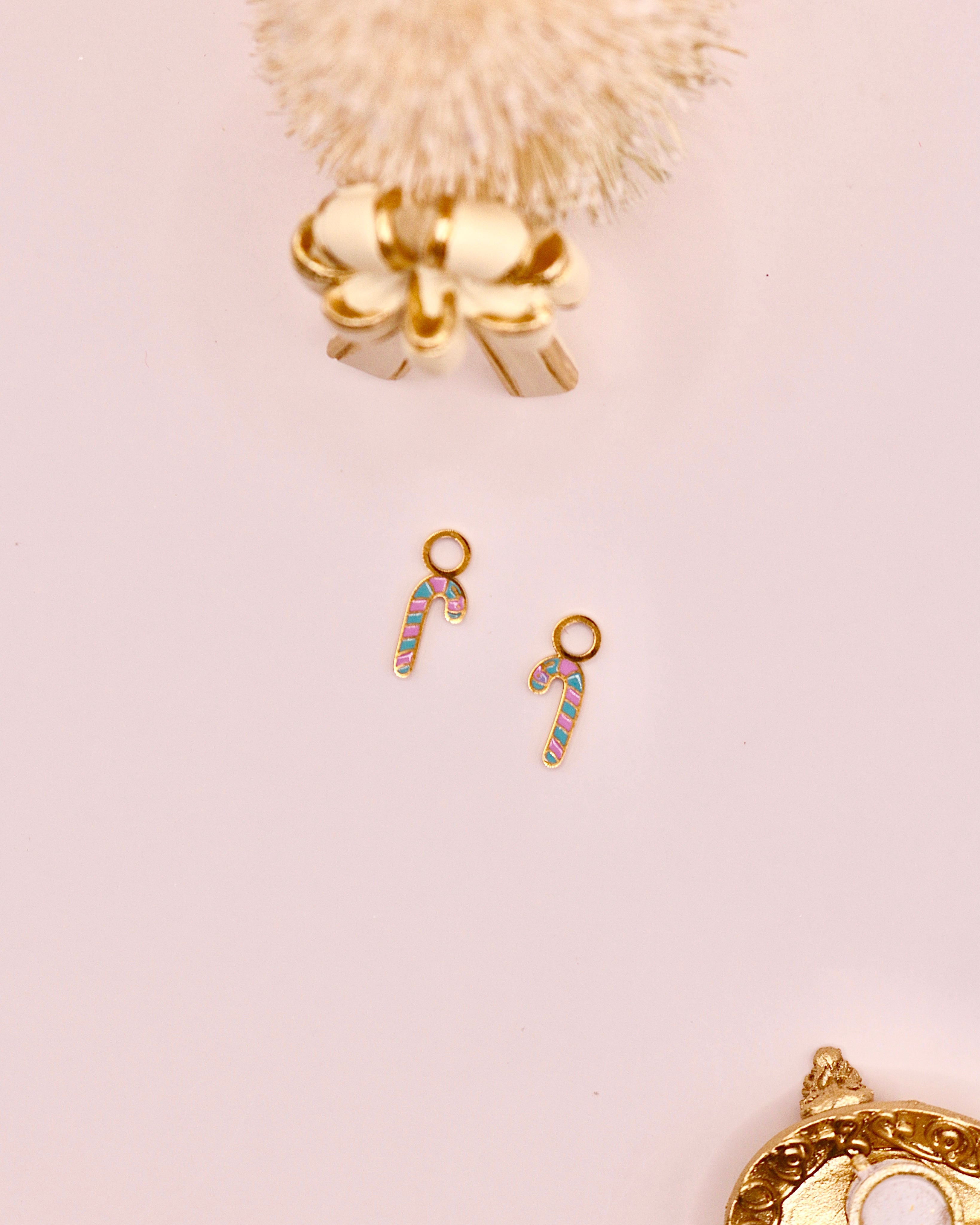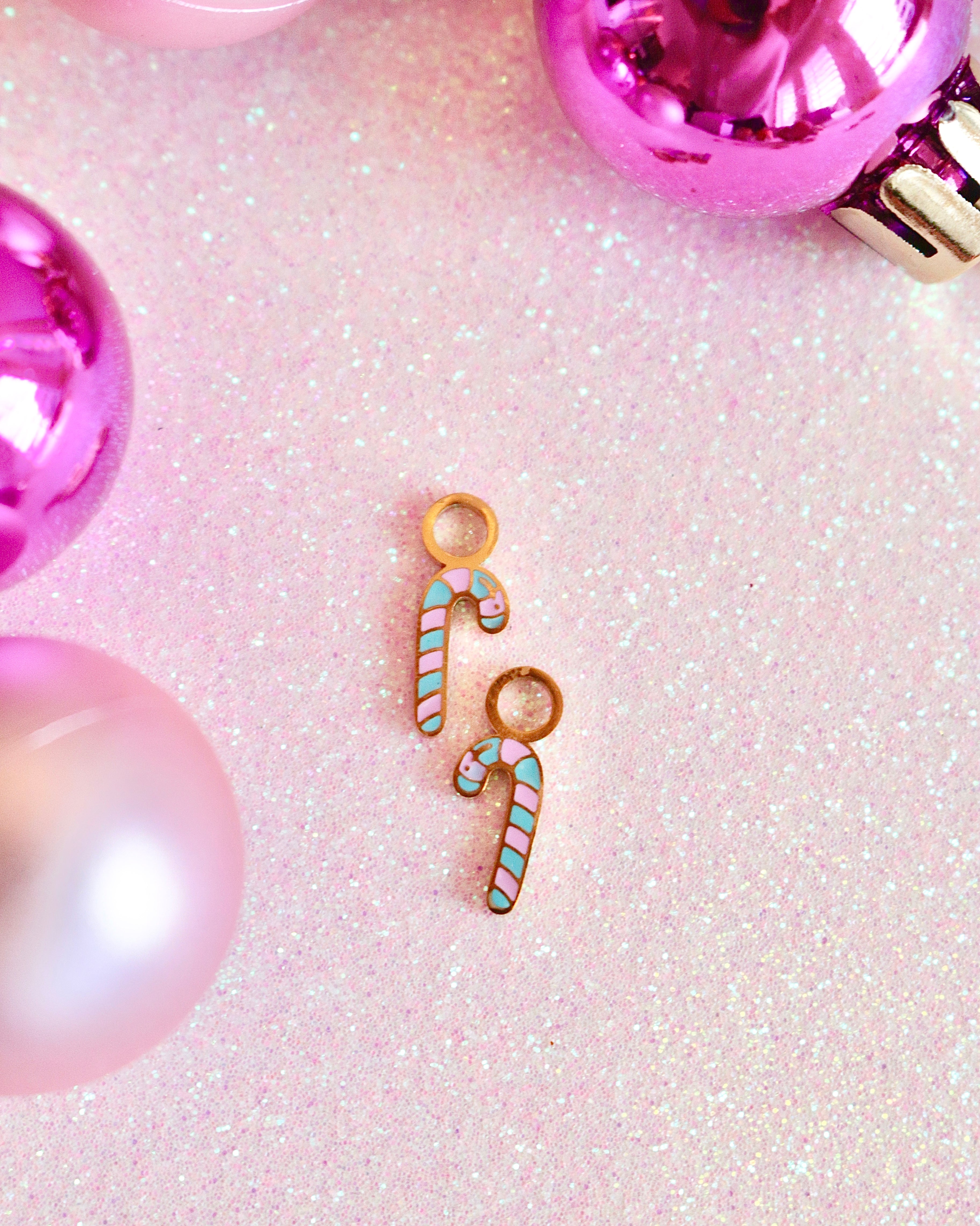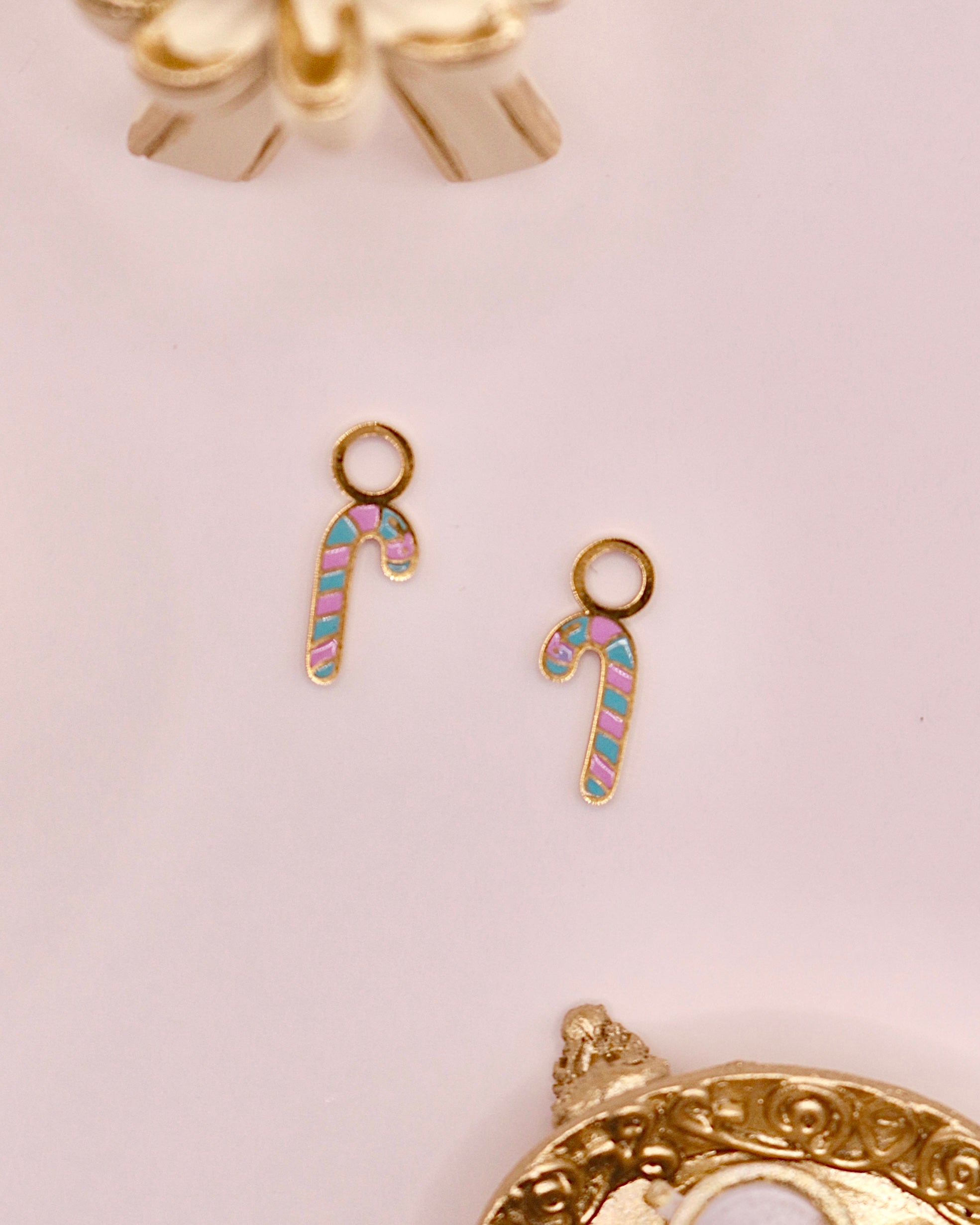 These cute candy-cane charms are 18k gold plated and made from hypoallergenic materials, making them suitable for even the most sensitive ears. They feature light pink and blue striped details. Pair these cute charms with our gold huggies. Add this cute custom design to your collection now!