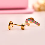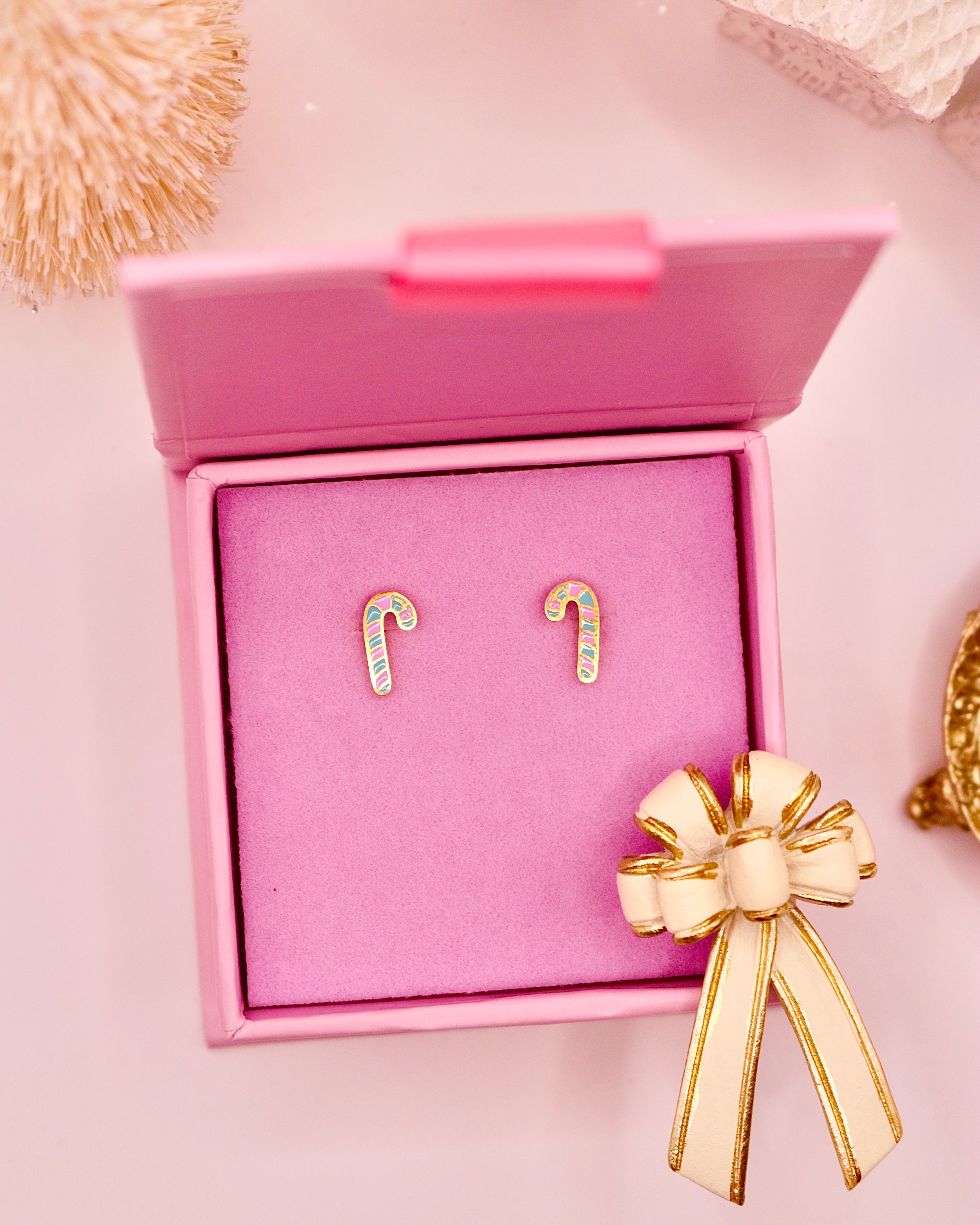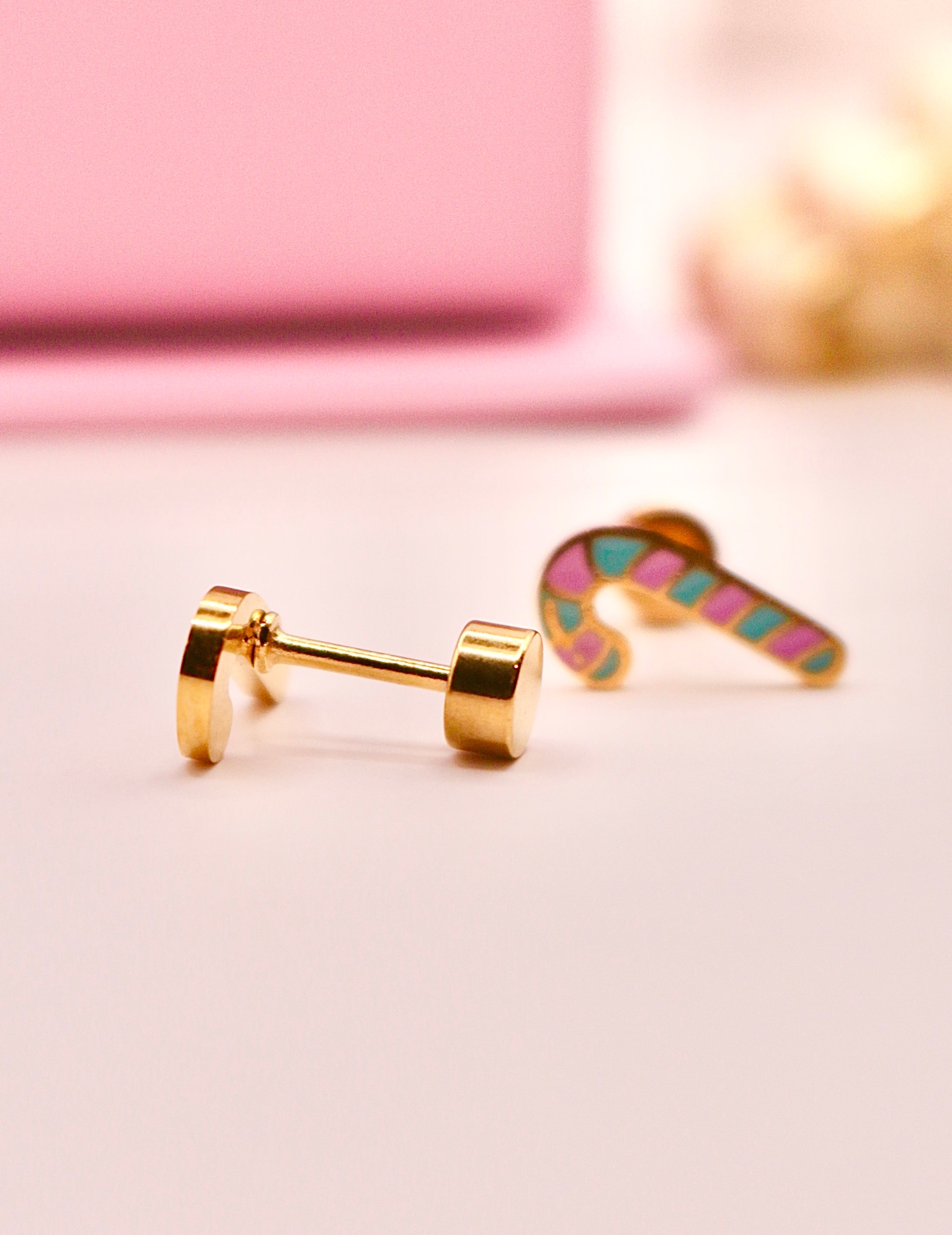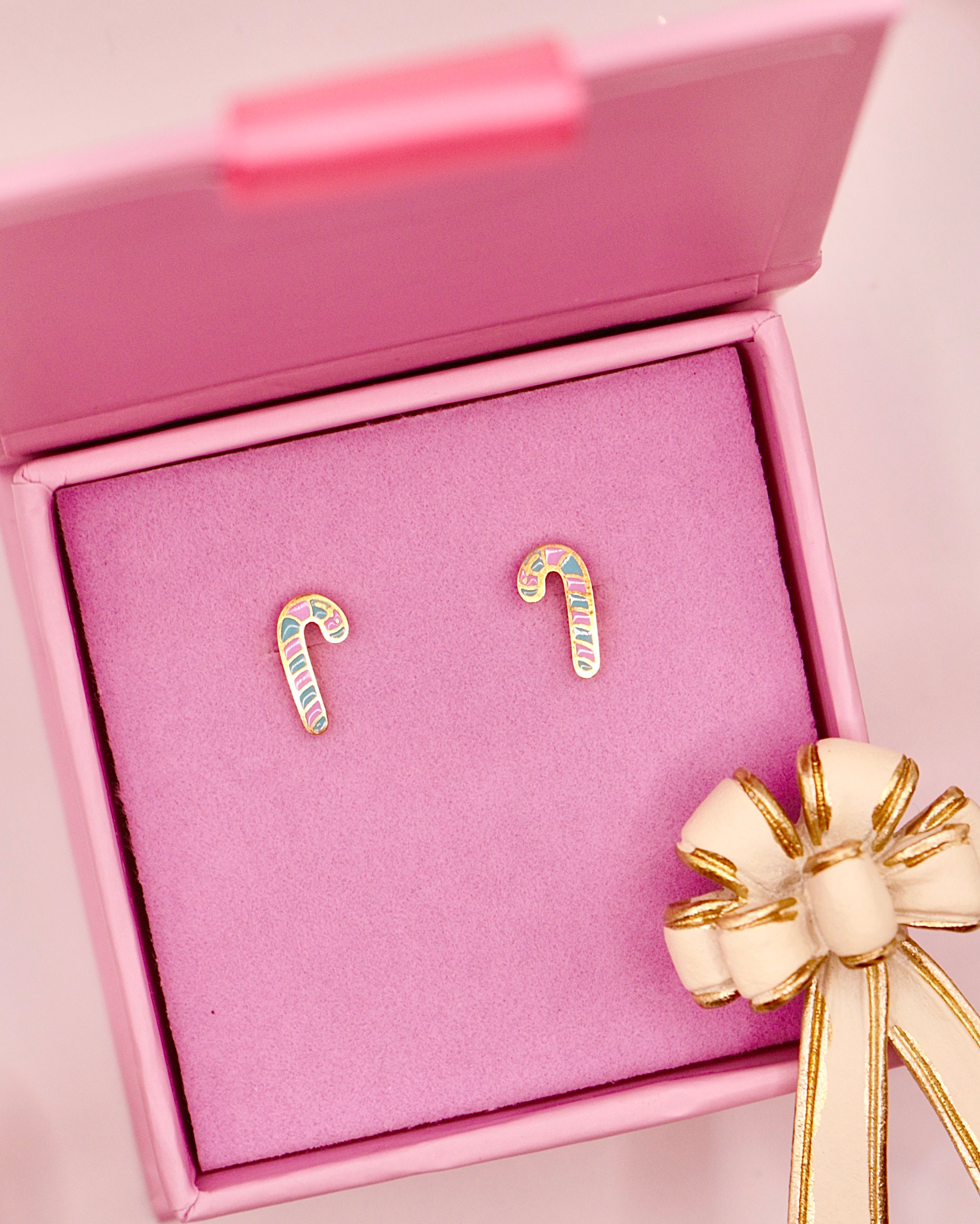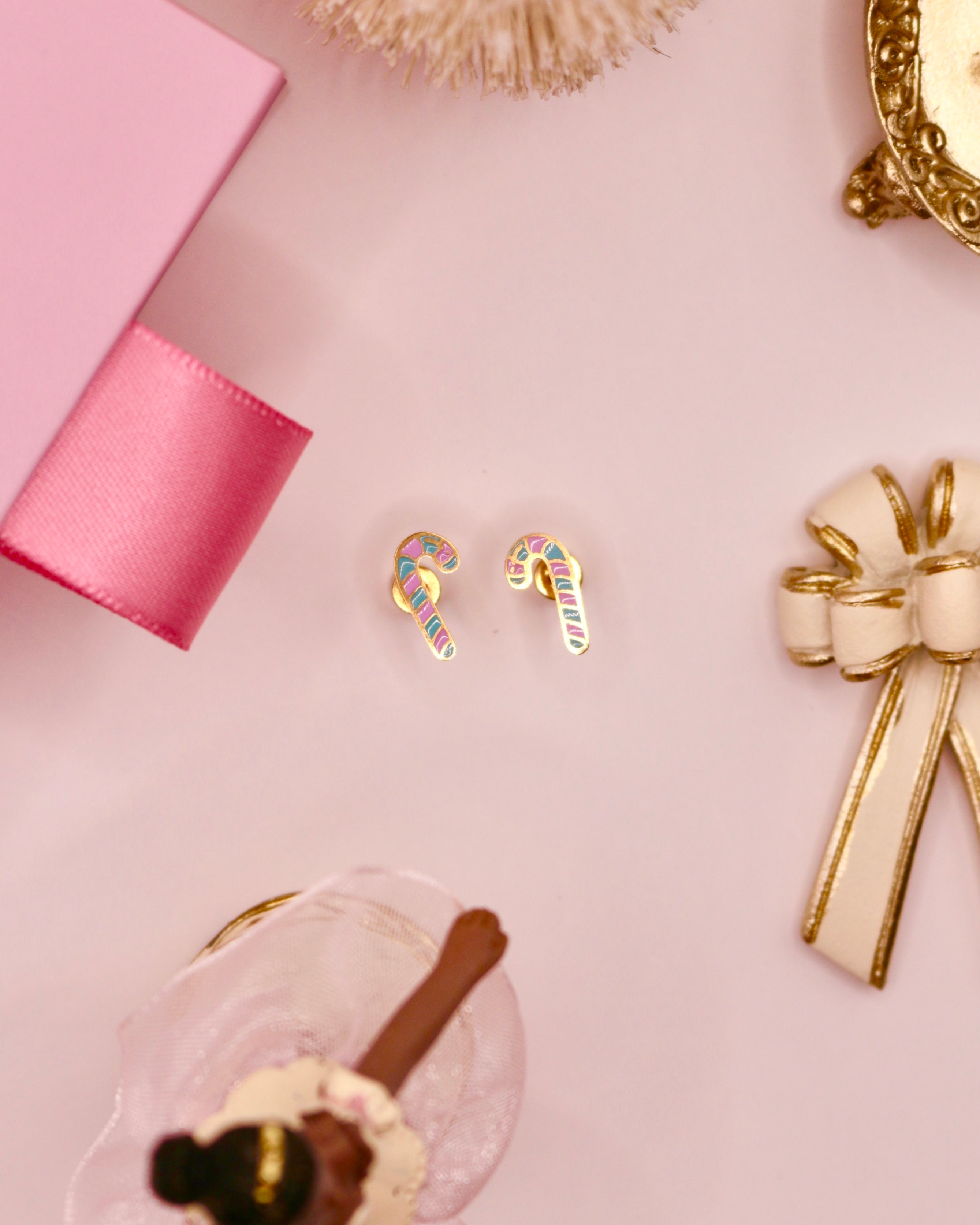 These cute candy-cane earrings are 18k gold plated and made from hypoallergenic materials, making them suitable for even the most sensitive ears. They feature light pink and blue striped details. Their cute and dainty appearance is complemented by a flat back closure, ensuring a comfortable and secure fit. Add this cute custom design to your collection now!