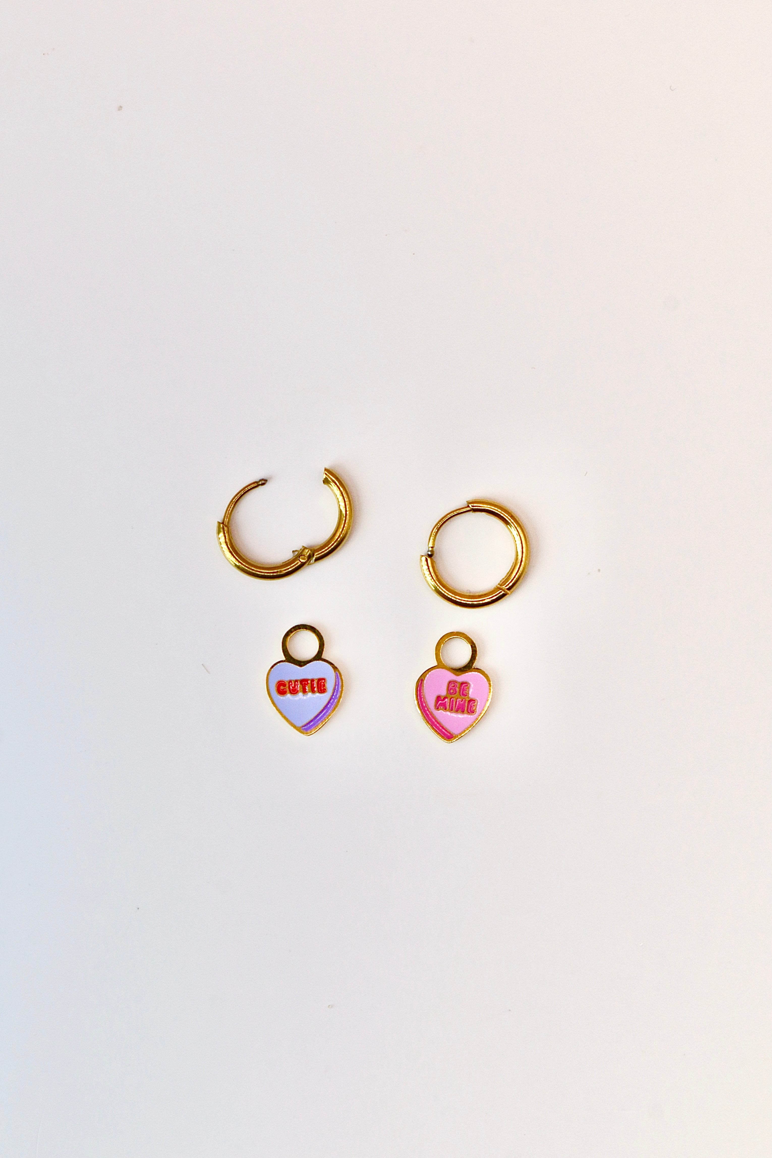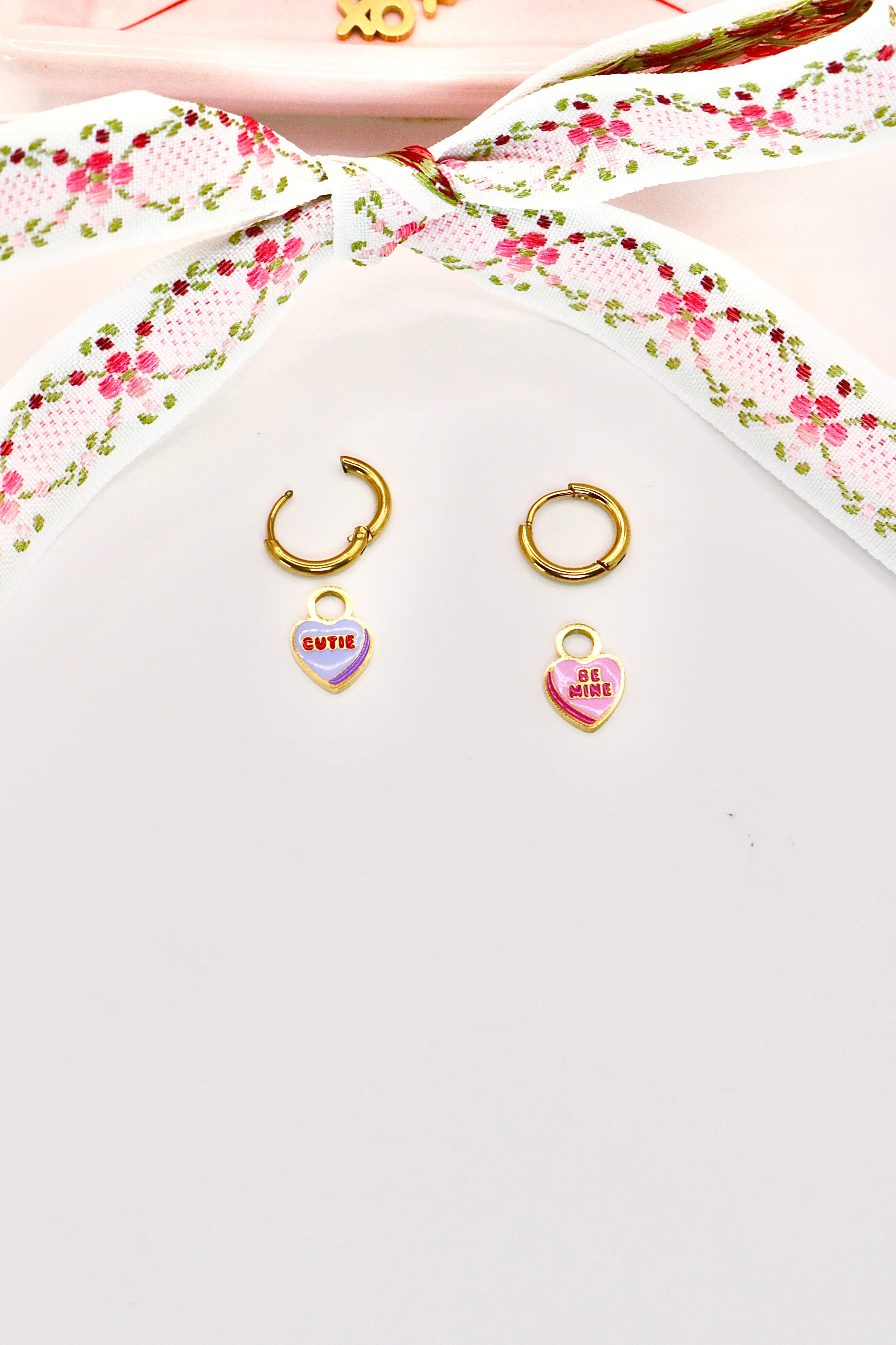 These cute Candy Heart charms are 14k gold plating and made from hypoallergenic materials, making them suitable for even the most sensitive ears. In a darling pink and purple mismatched style you and your little will love these earrings. One earring has "Be Mine" and the other "Cutie". Add this nostalgic design to your stack now.