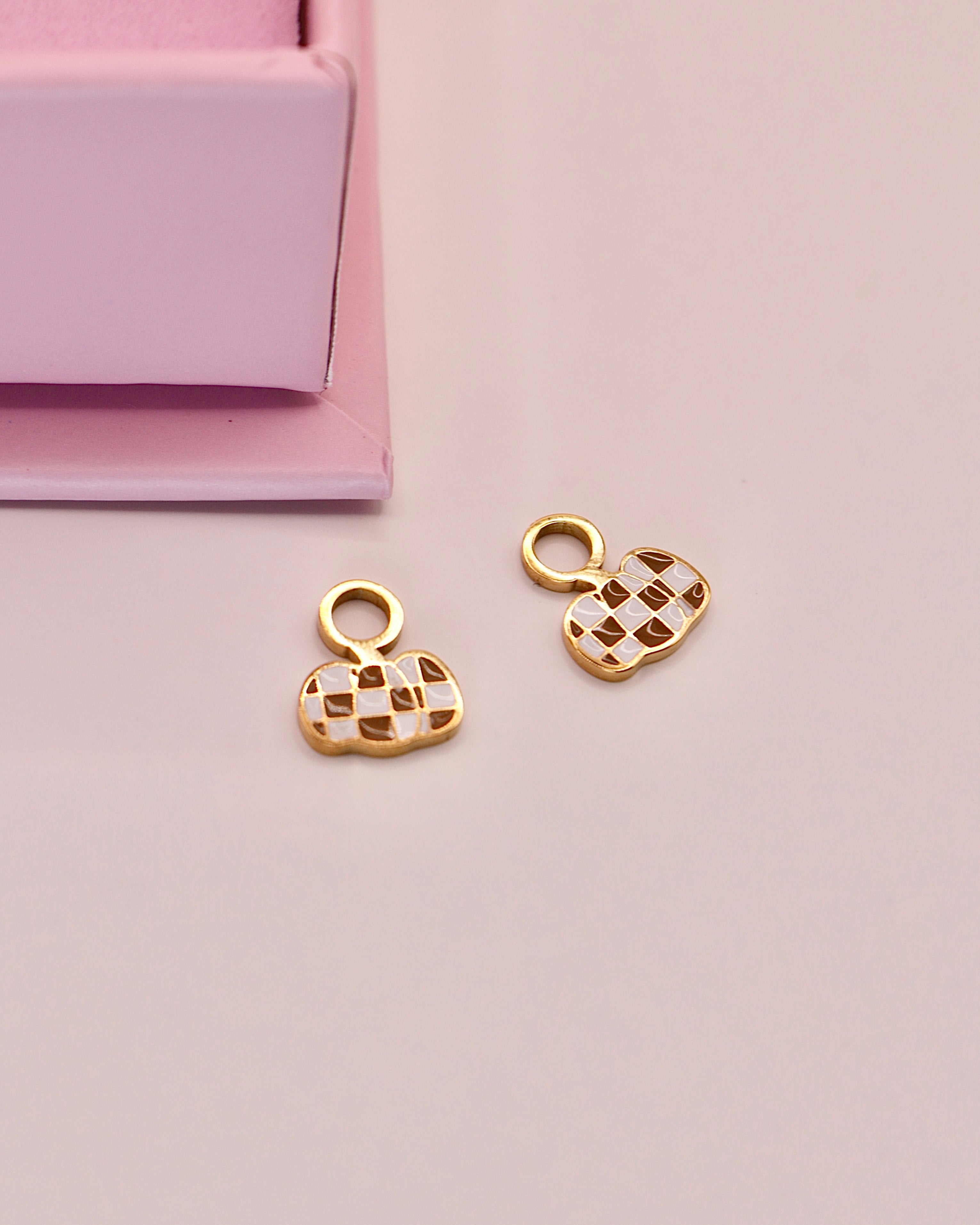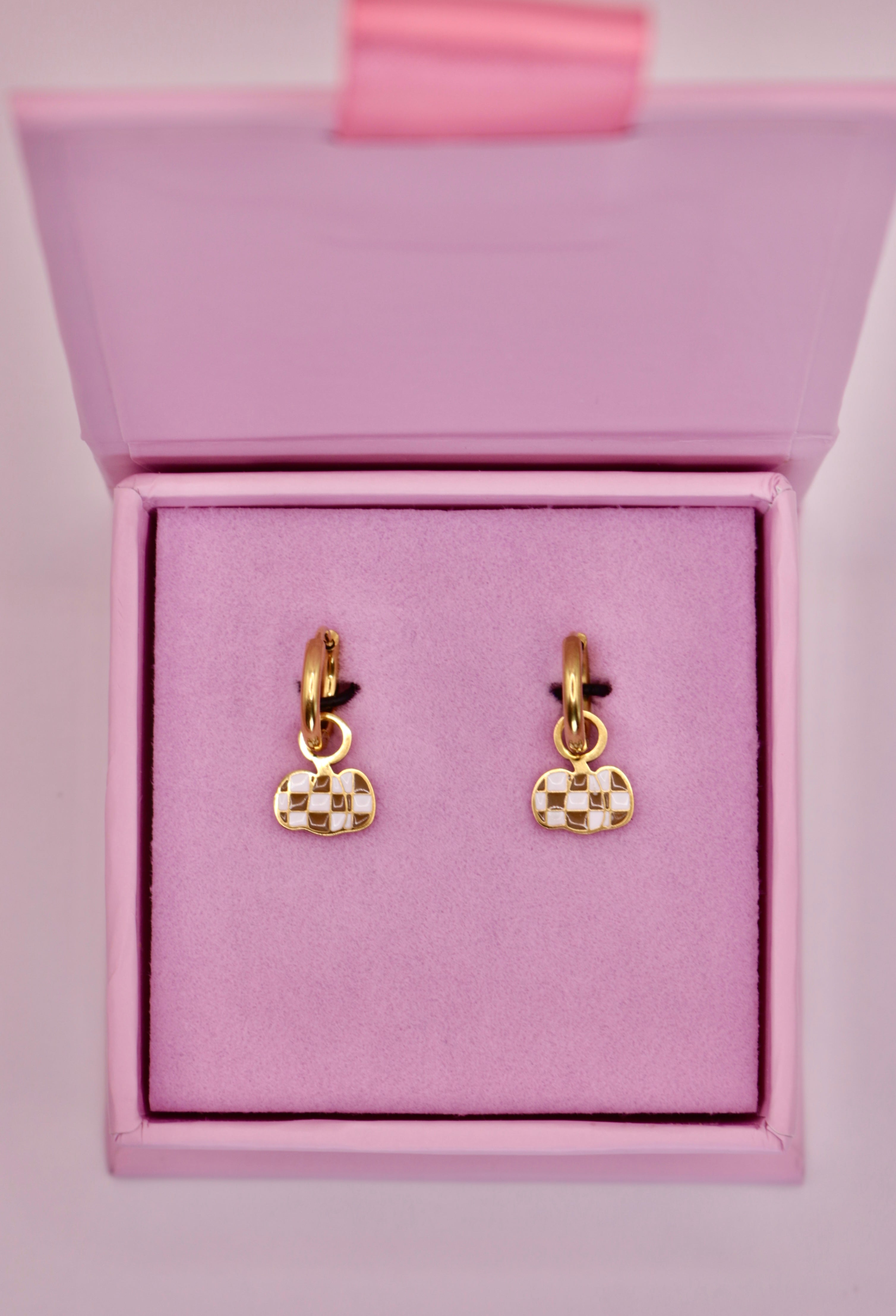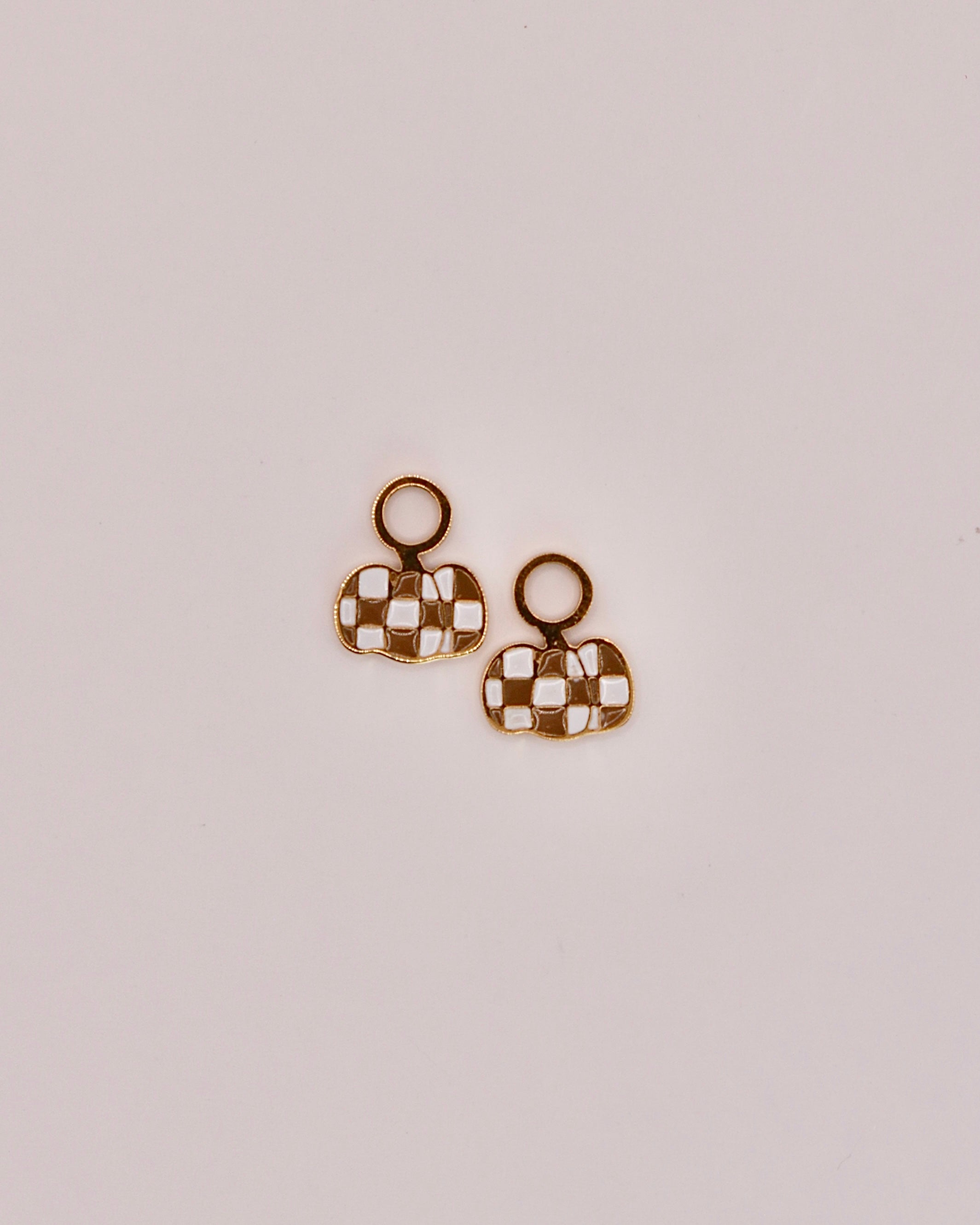 These gold and white checkered pumpkin charms are 18k gold plated for quality you can trust, water resistant and tarnish free! Made to pair with our gold huggies, these dangling charms are the cutest accessory. Wear these in the tub, at the pool or to work out! These were made to live in. Perfect for girls and women of all ages. Upgrade your accessory game with these stylish and functional earrings, perfect for all-day wear.