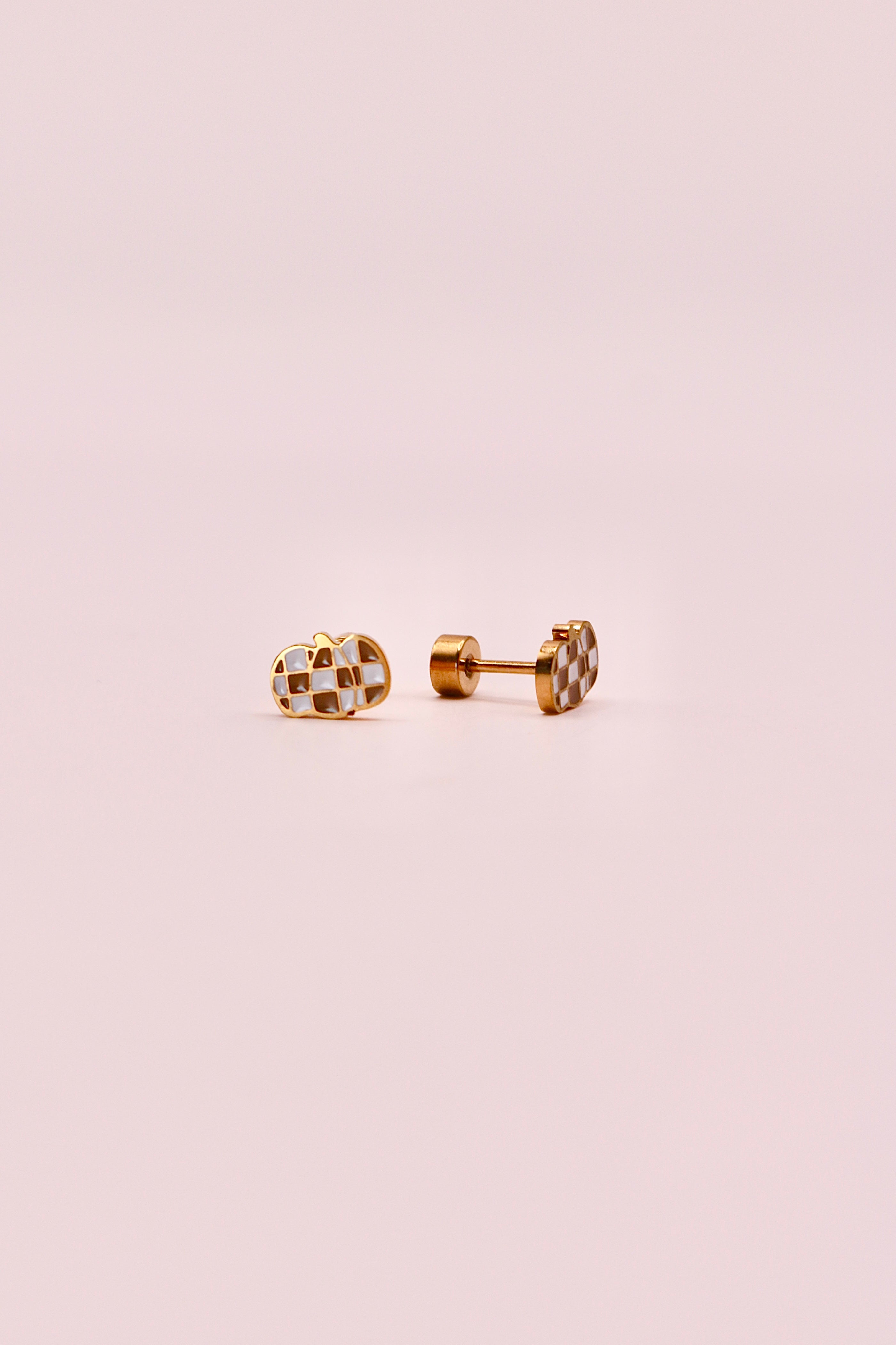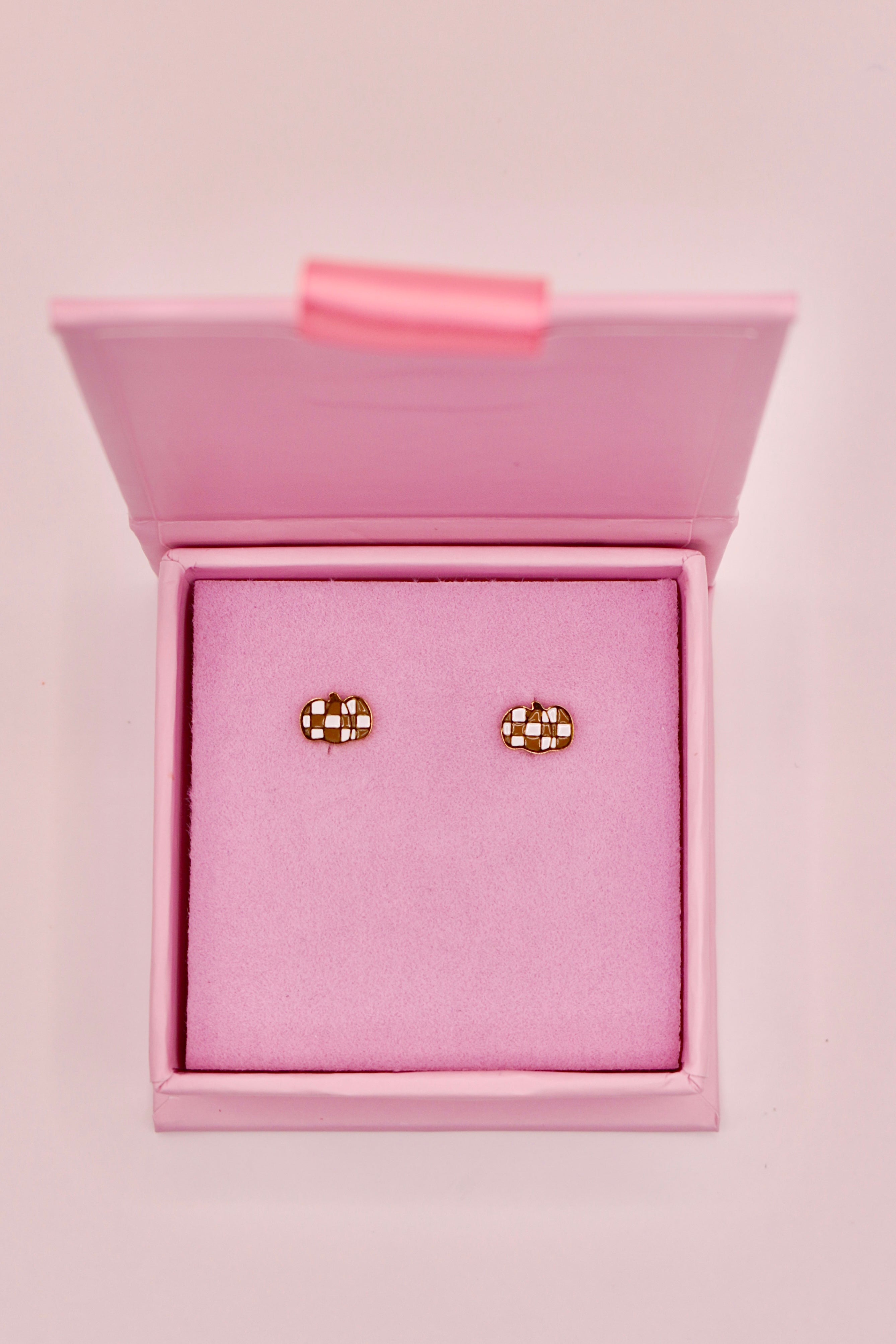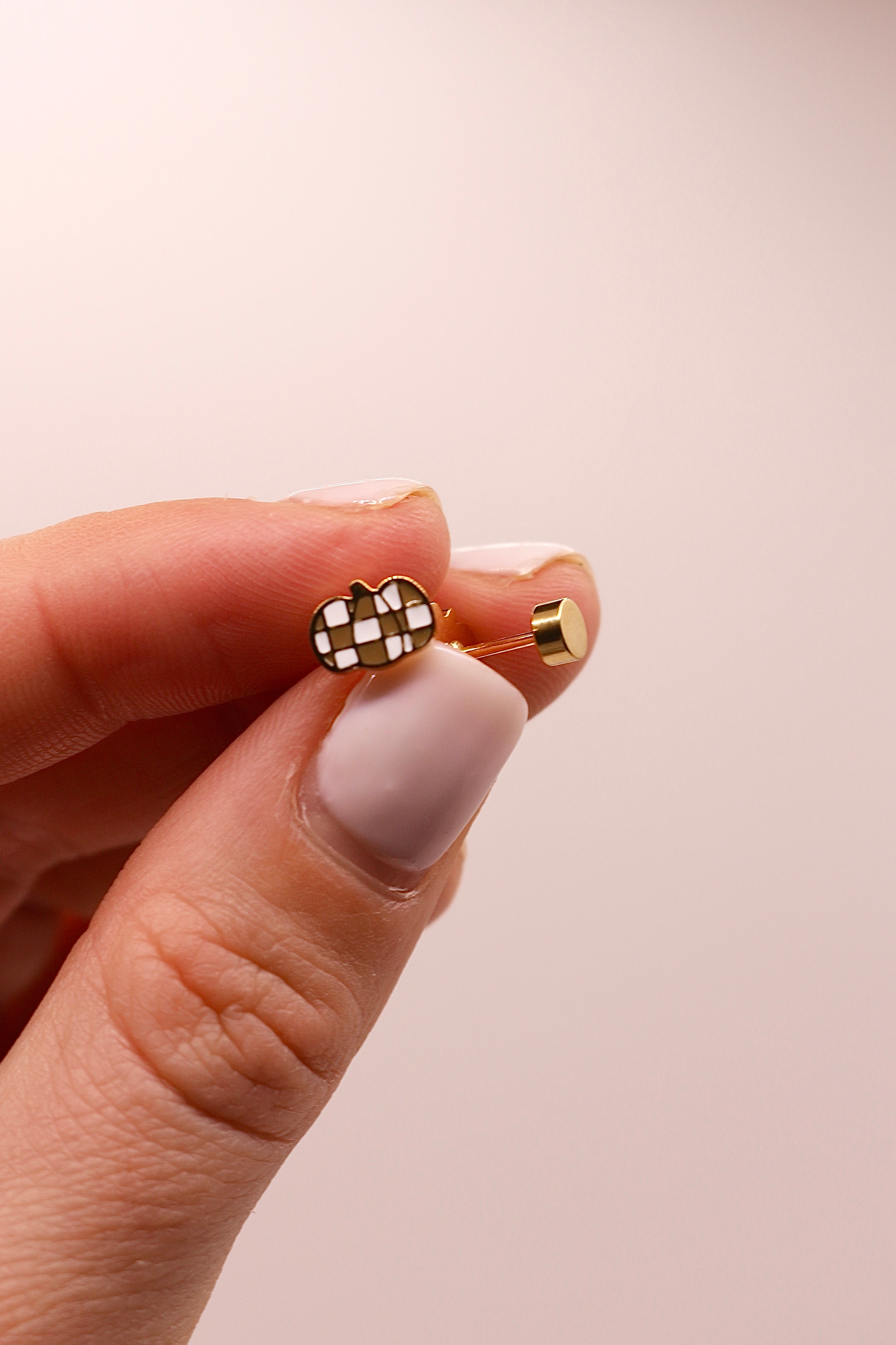 These gold and white checkered pumpkin earrings are 18k gold plated for quality you can trust, water resistant and tarnish free! Made with screw back posts for comfort with no poking ever again! Wear these in the tub, at the pool or to work out! These were made to live in. Perfect for girls and women of all ages. Upgrade your accessory game with these stylish and functional earrings, perfect for all-day wear.