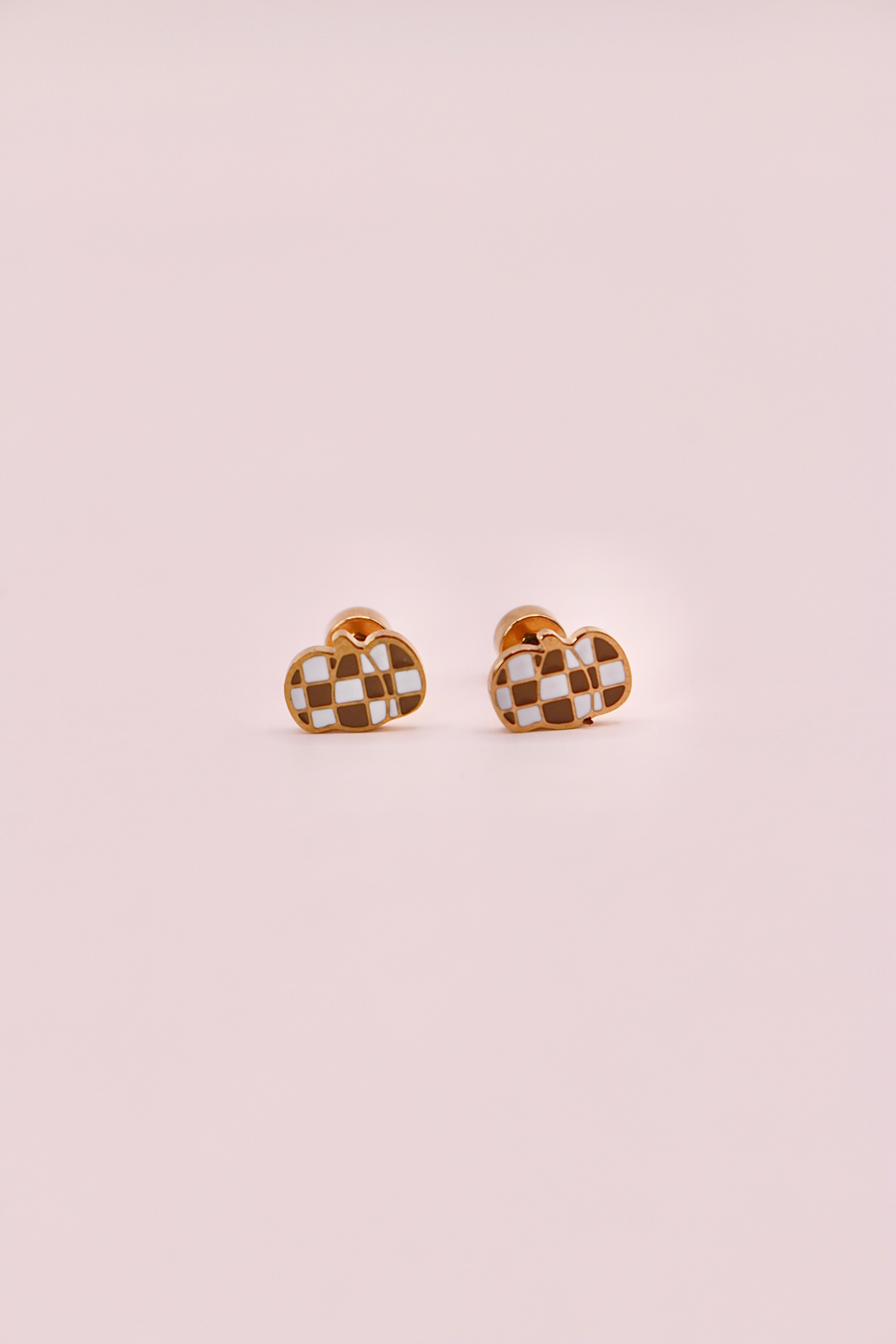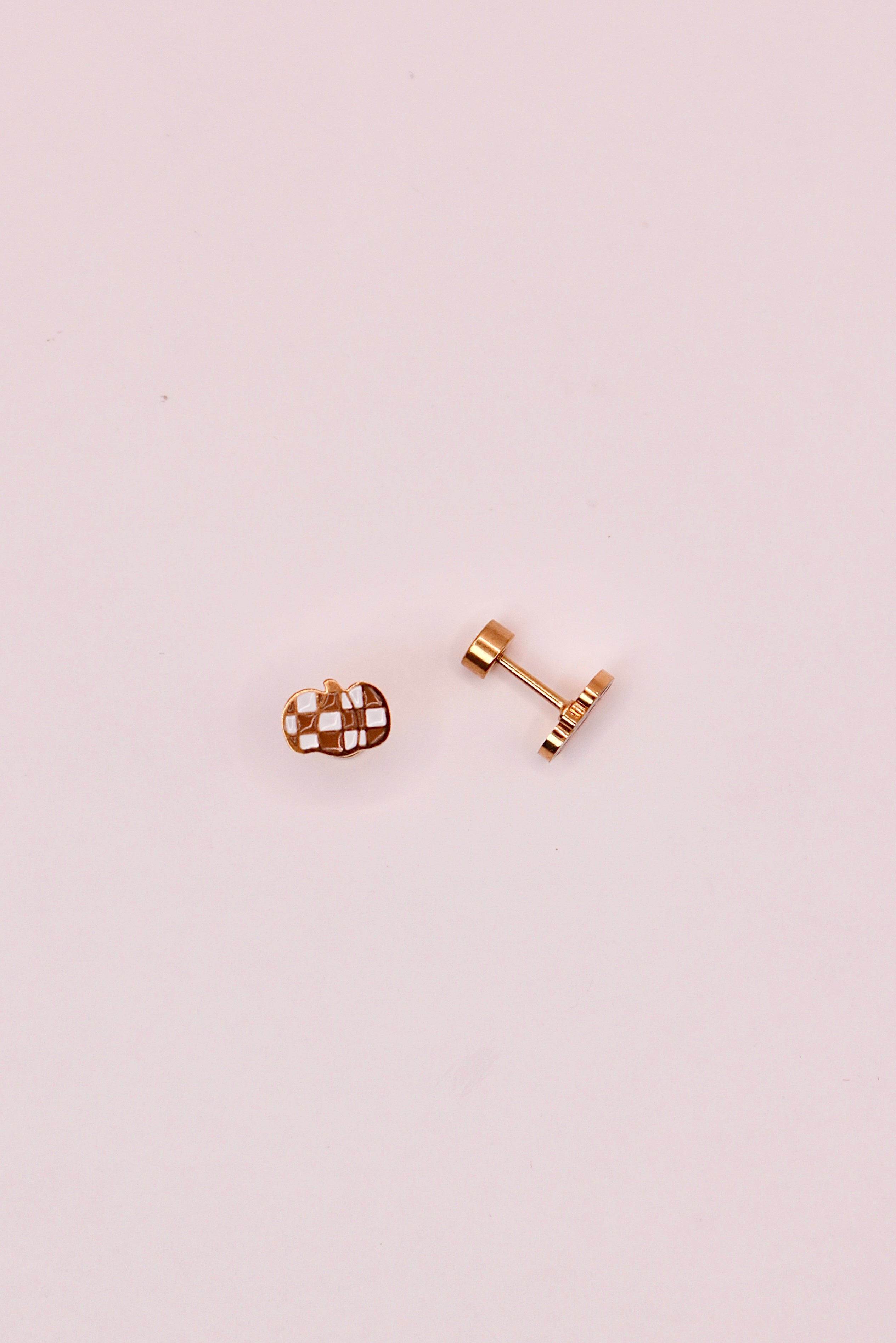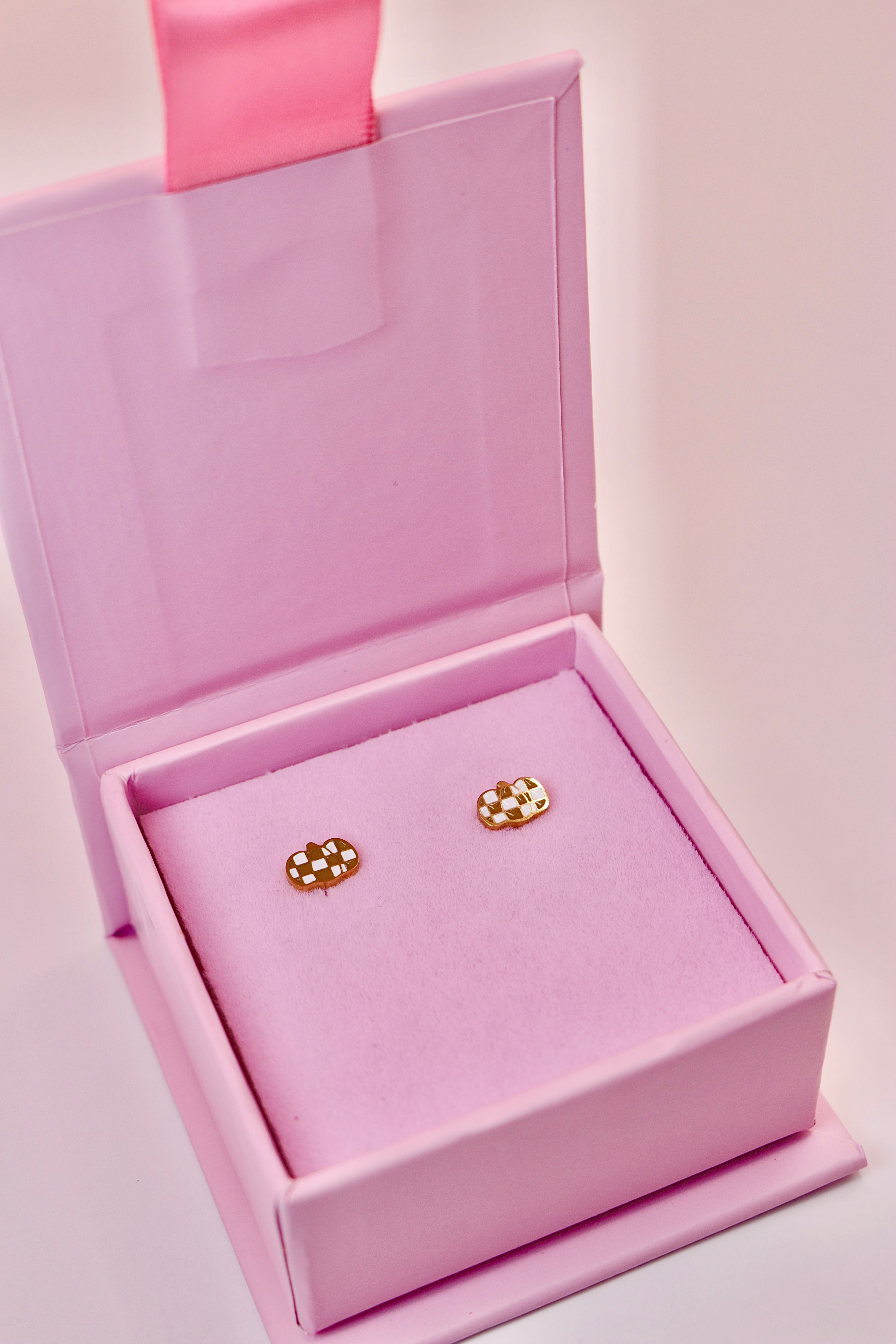 These gold and white checkered pumpkin earrings are 18k gold plated for quality you can trust, water resistant and tarnish free! Made with screw back posts for comfort with no poking ever again! Wear these in the tub, at the pool or to work out! These were made to live in. Perfect for girls and women of all ages. Upgrade your accessory game with these stylish and functional earrings, perfect for all-day wear.