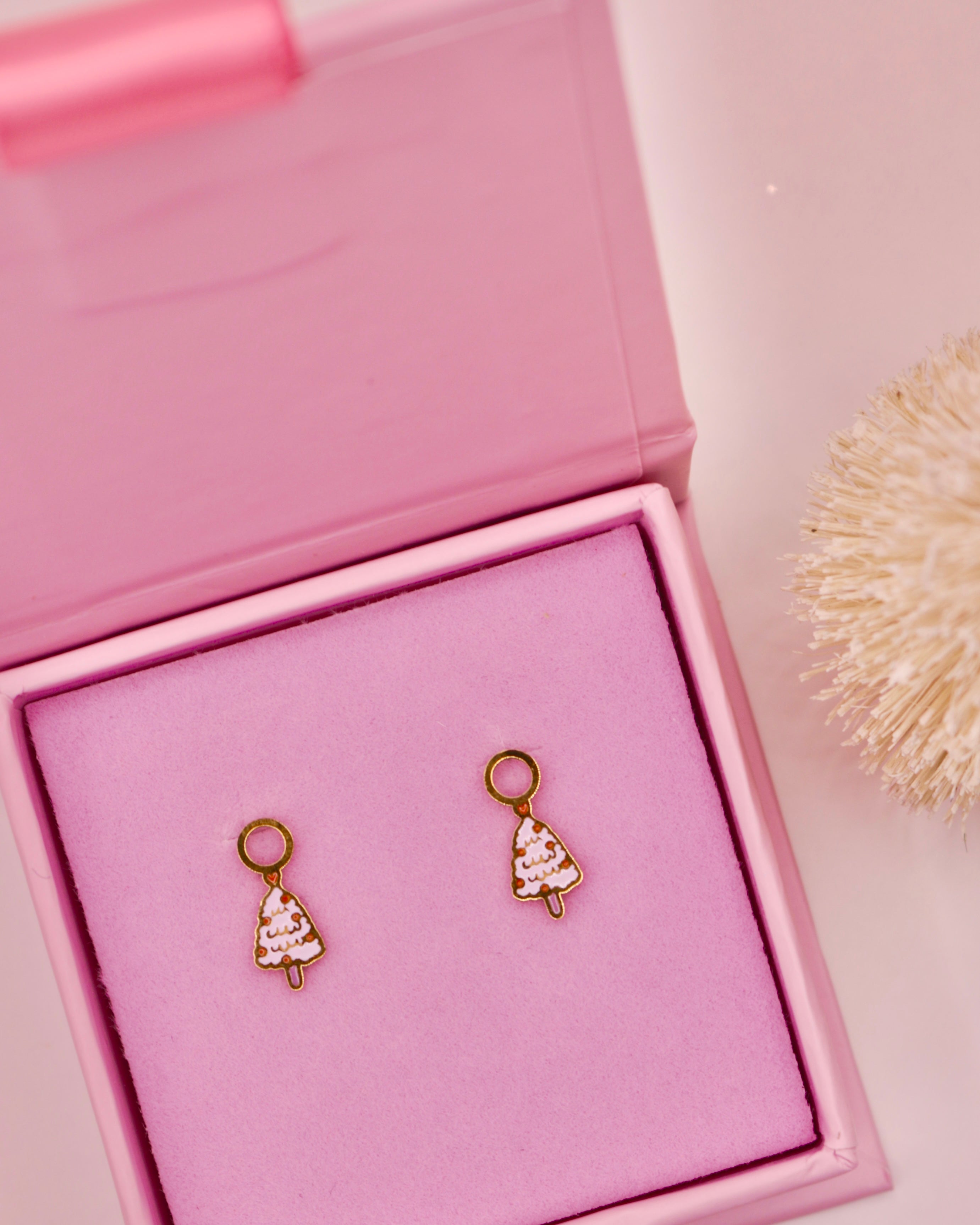 These cute Christmas Tree charms are 18k gold plated and made from hypoallergenic materials, making them suitable for even the most sensitive ears. They feature a light pink tree and red ornaments. Their cute and dainty appearance is a perfect pair with ur gold huggies. Add this cute custom design to your collection now!