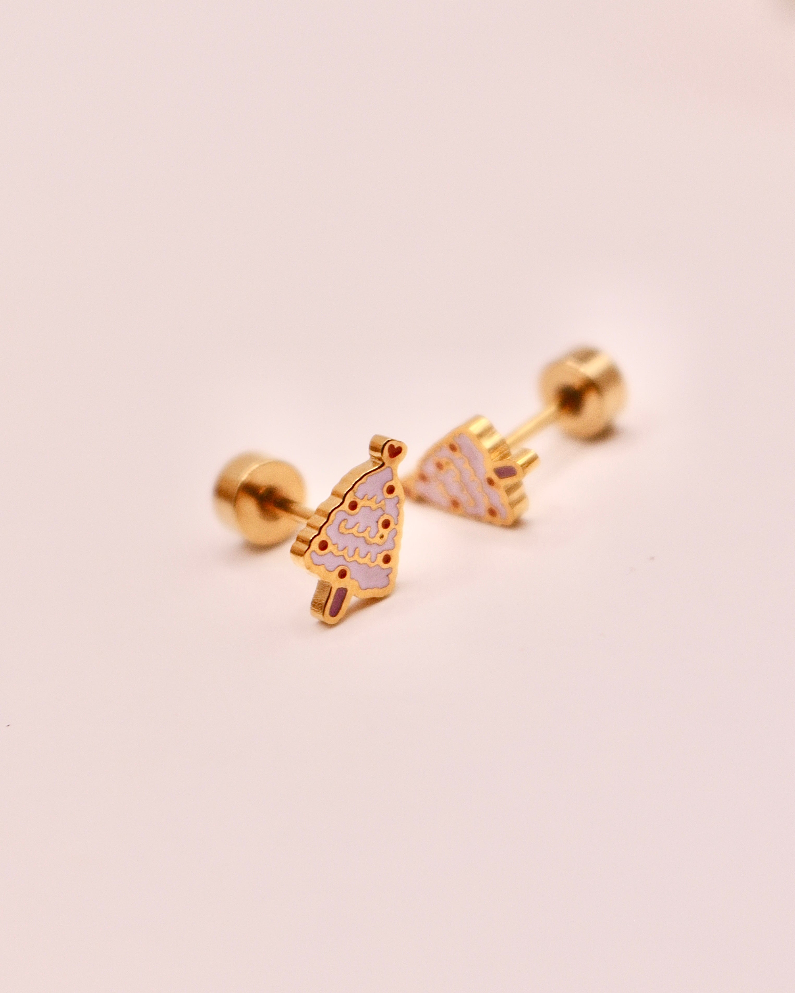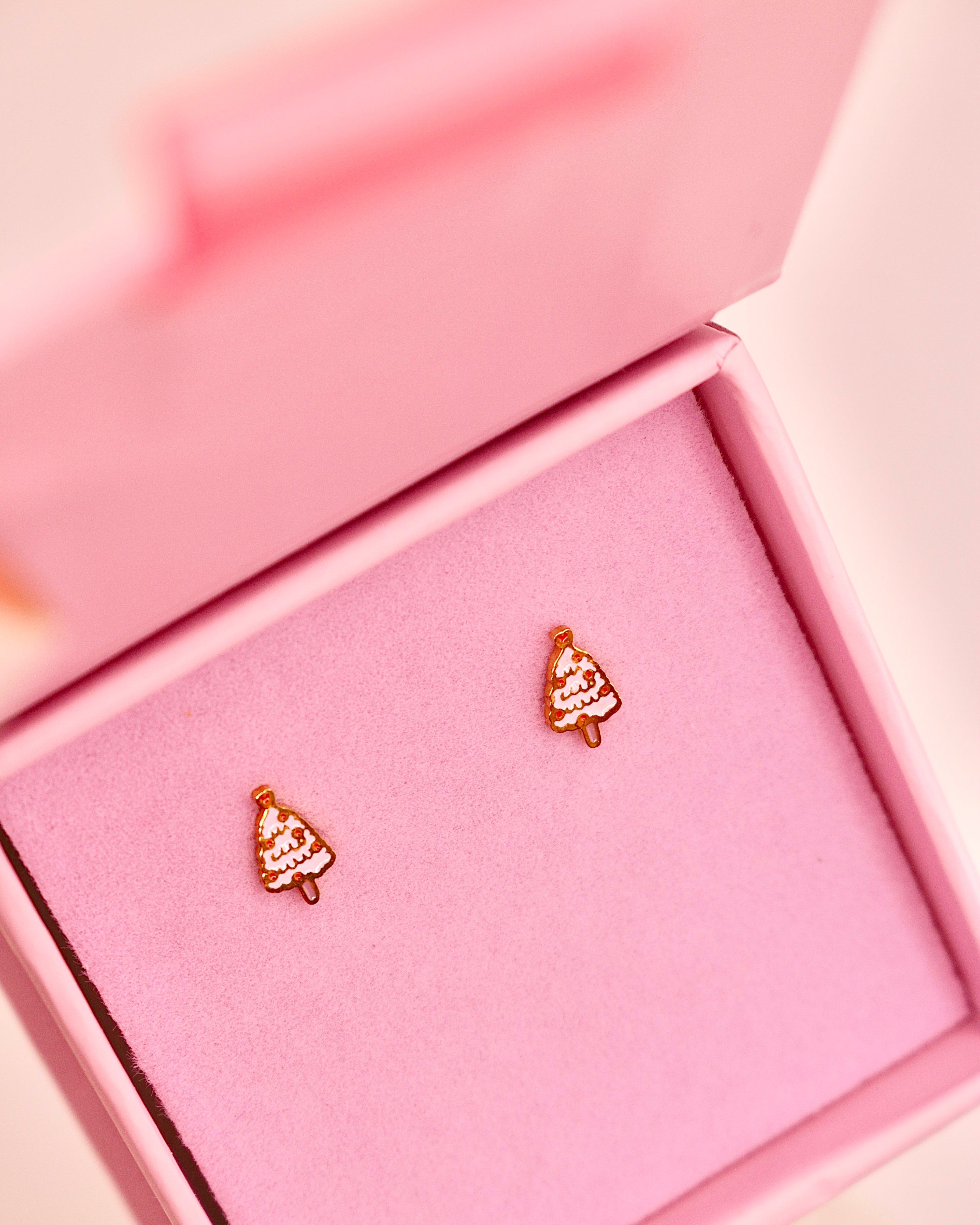 These cute Christmas Tree earrings are 18k gold plated and made from hypoallergenic materials, making them suitable for even the most sensitive ears. They feature a light pink tree and red ornaments. Their cute and dainty appearance is complemented by a flat back closure, ensuring a comfortable and secure fit. Add this cute custom design to your collection now!