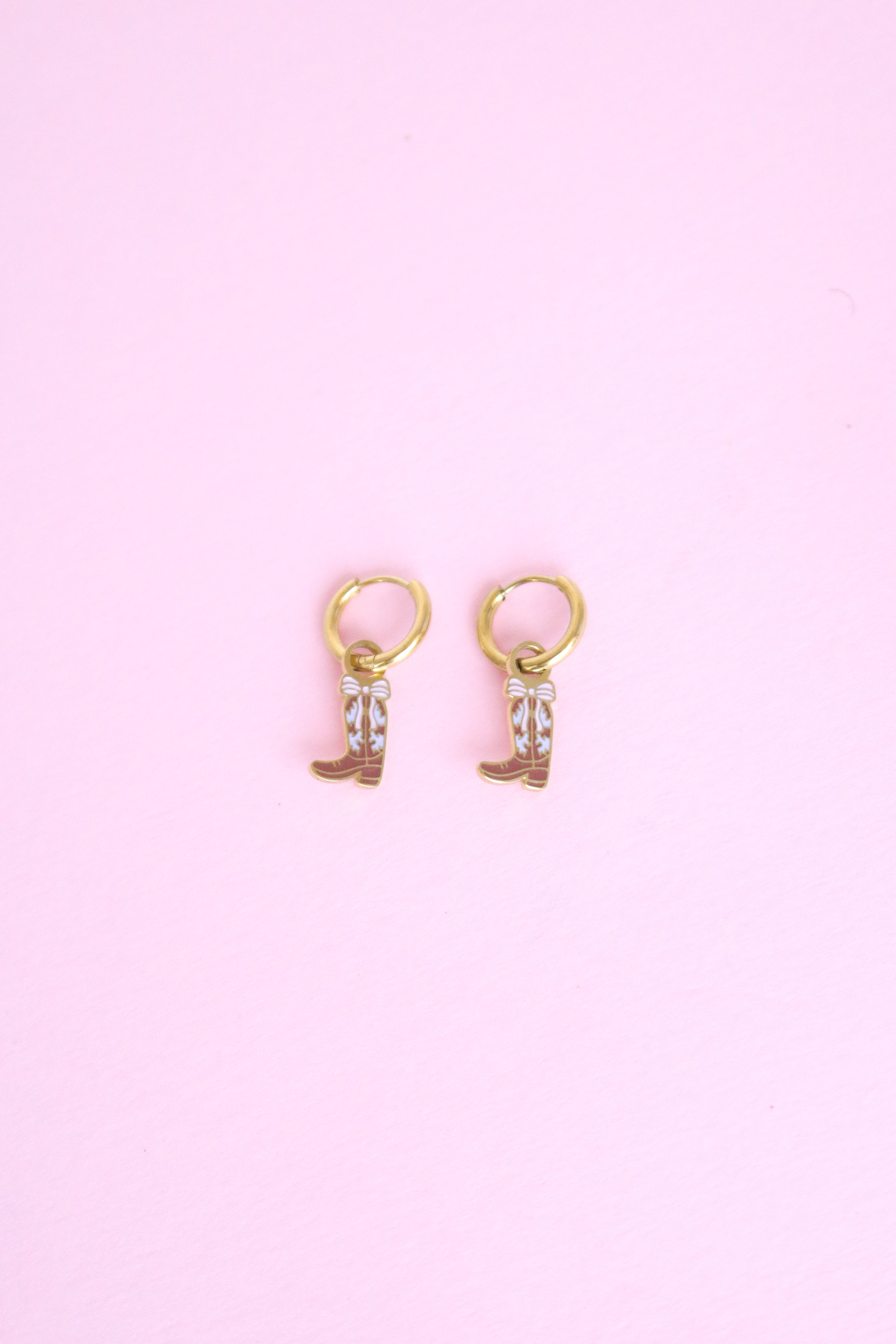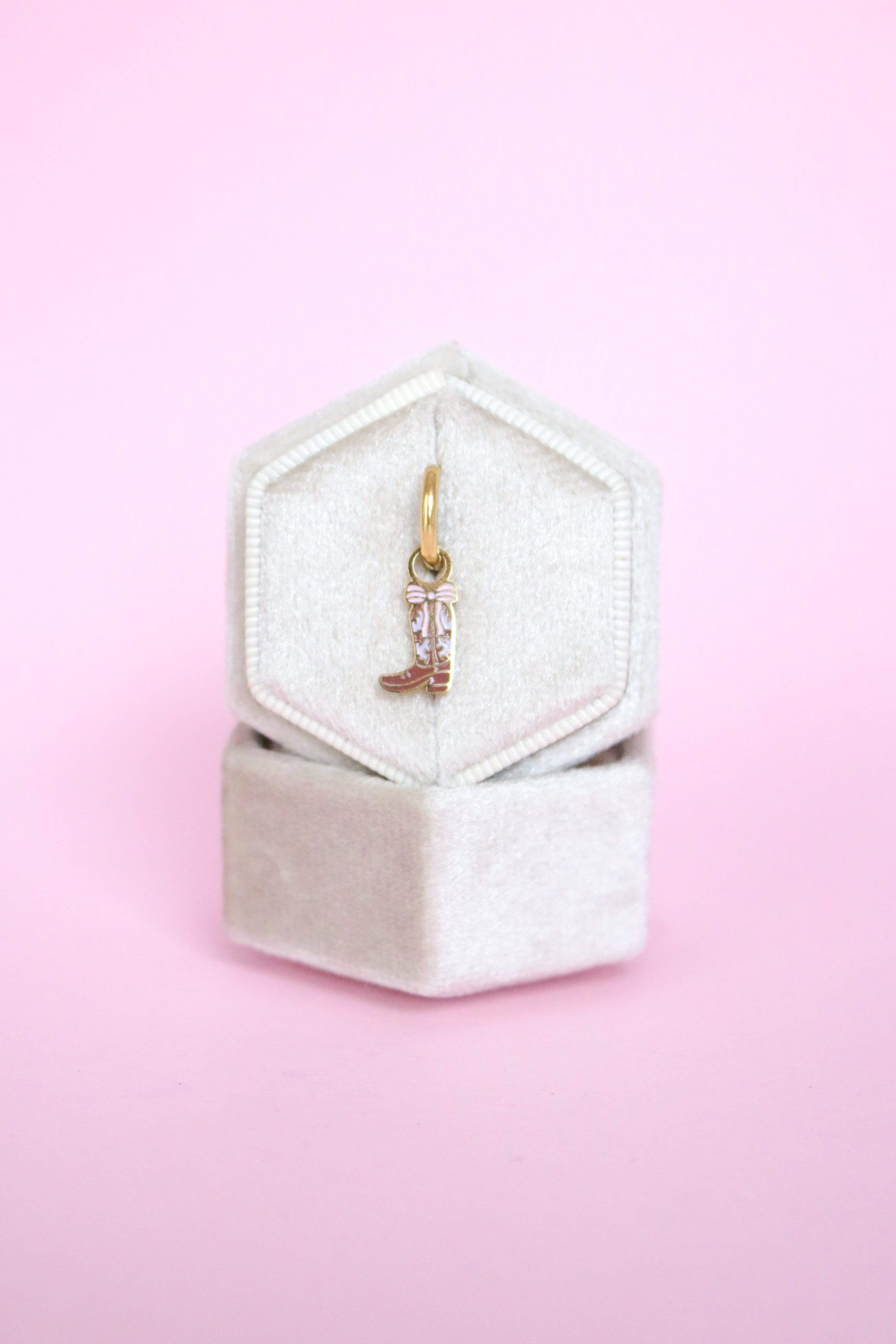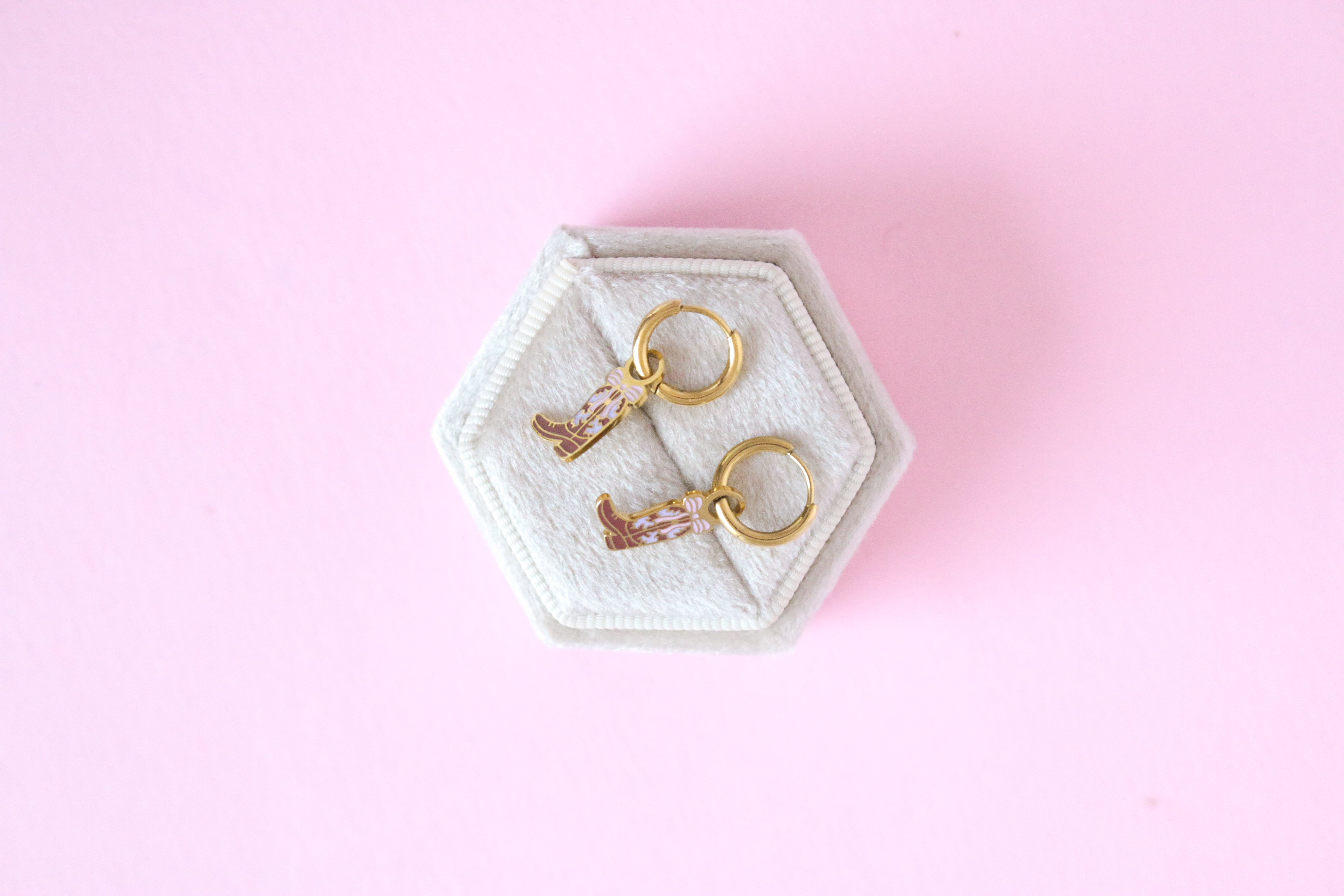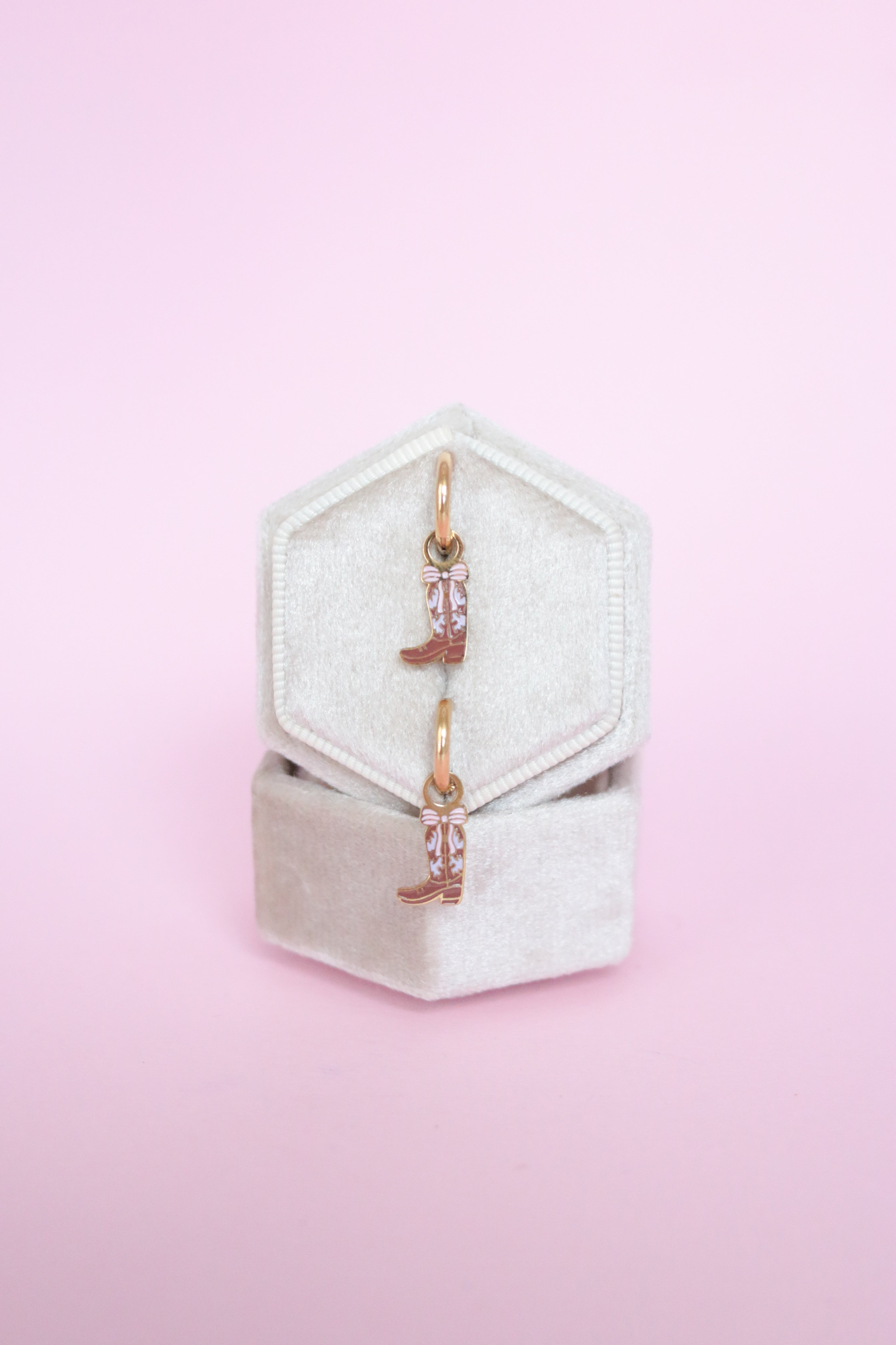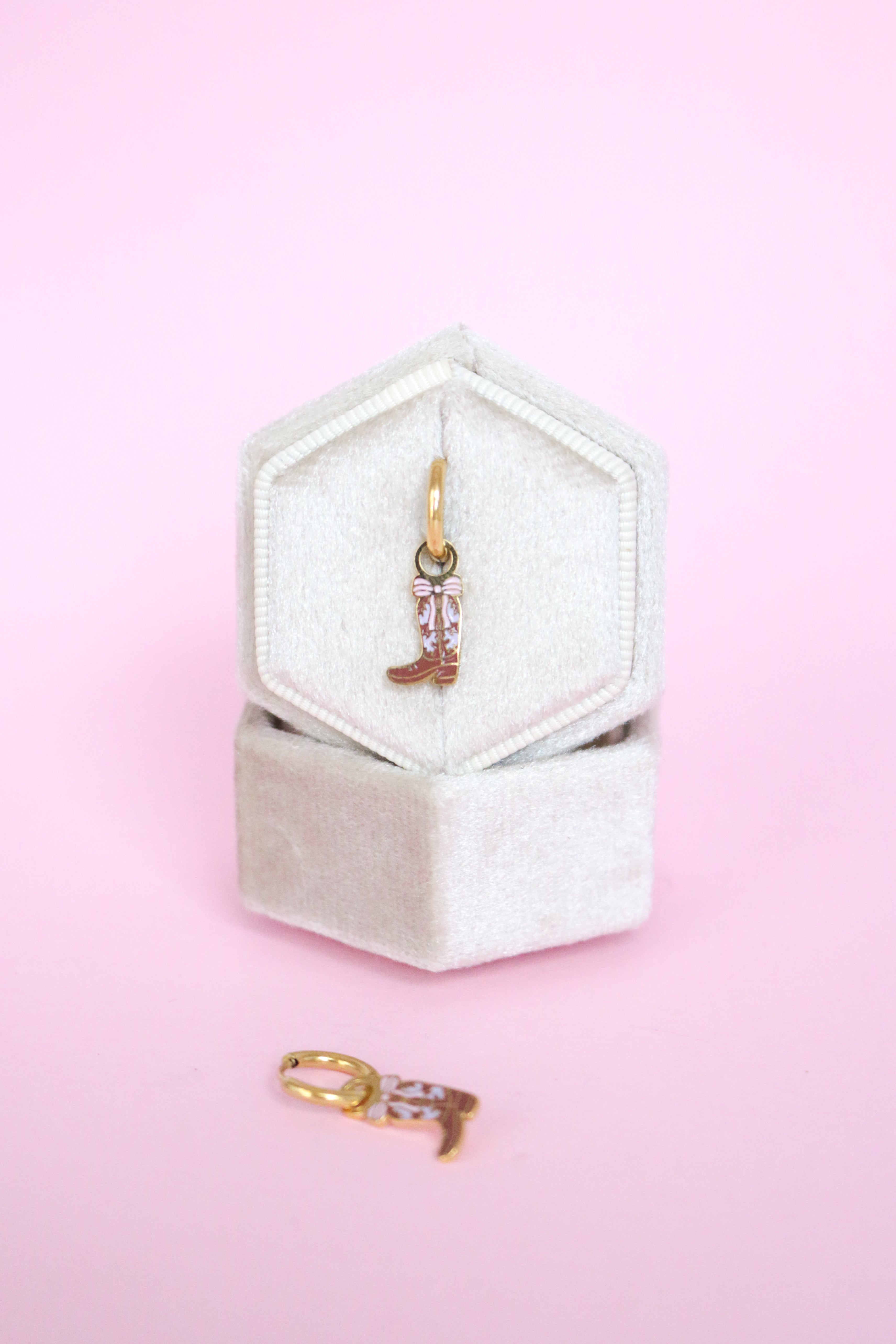 Long Live Cowgirls! These cute Cow Girl Boot charms are 14k gold plated and made from hypoallergenic materials, making them suitable for even the most sensitive ears. As part of our Western collection these cute and dainty charms pair perfectly with our gold huggies. Add this cute custom design to your stack now.