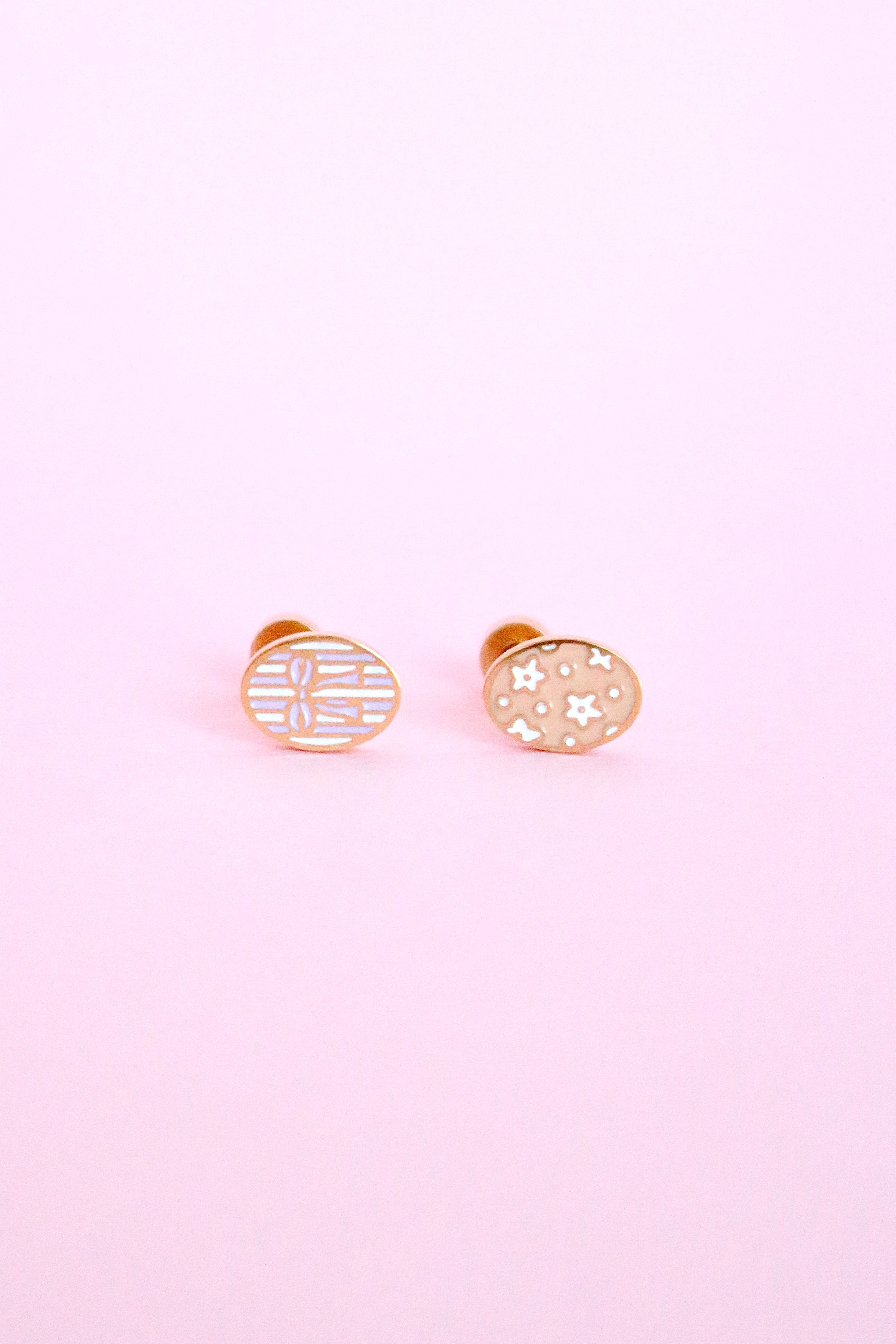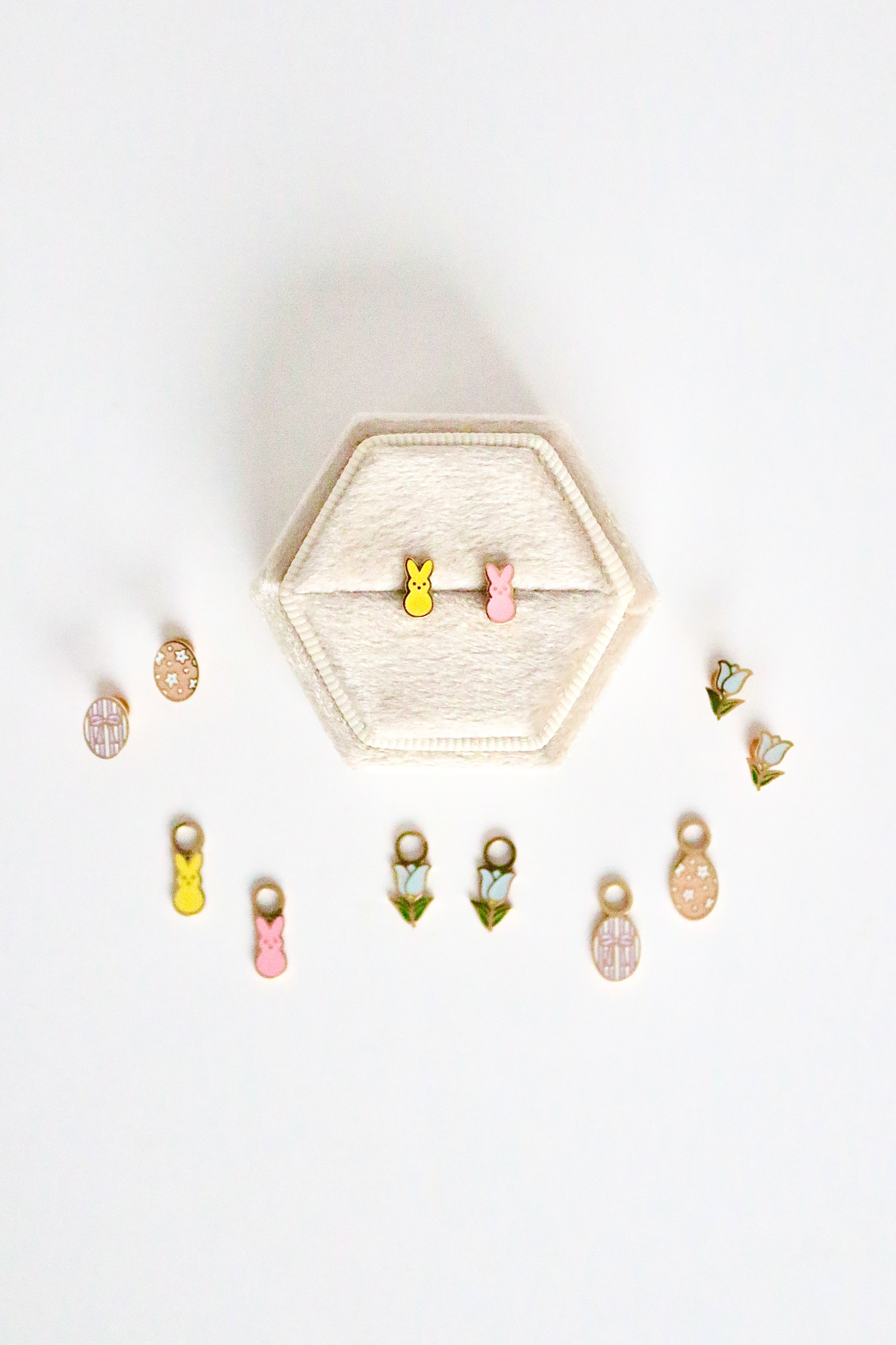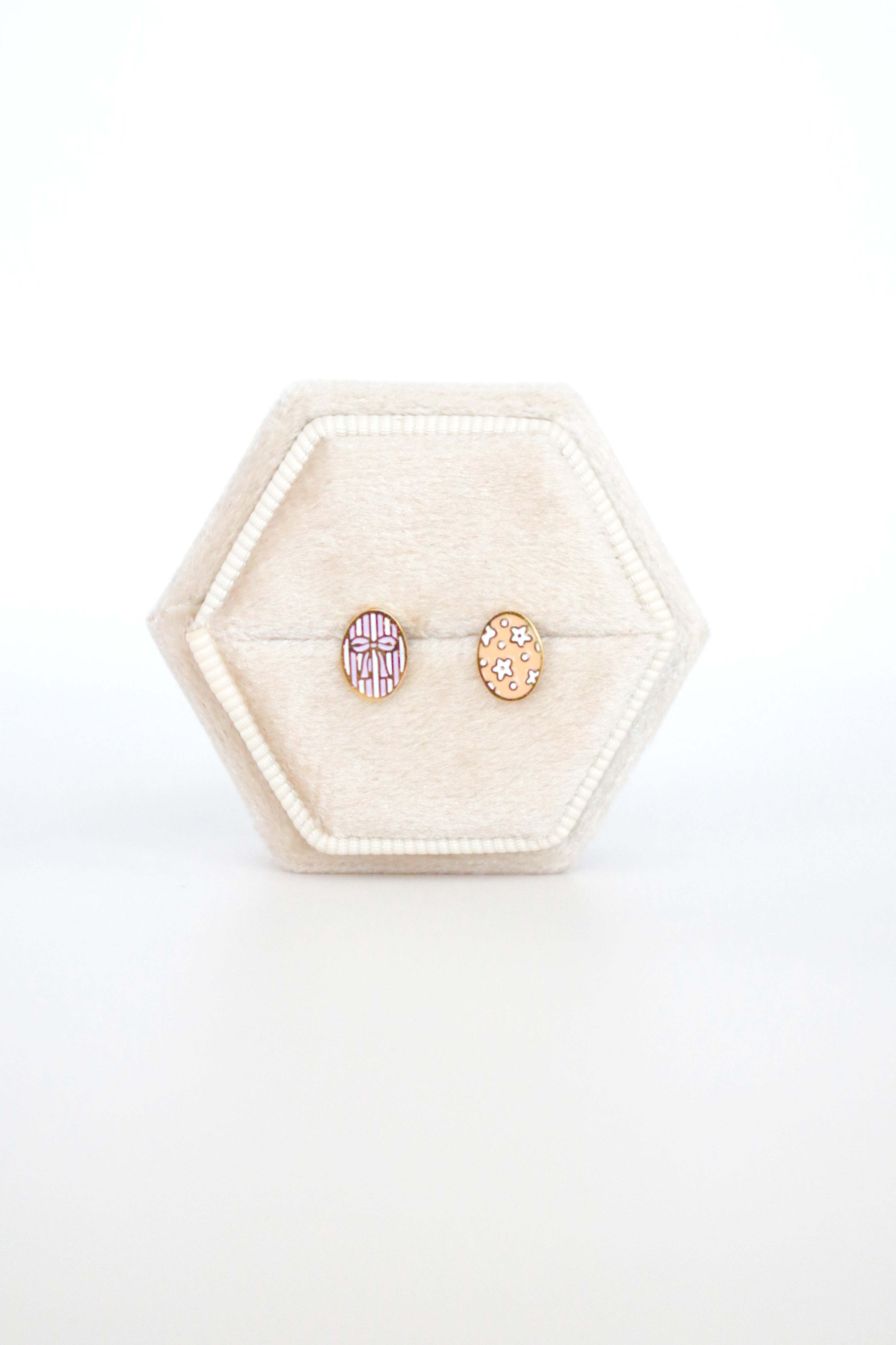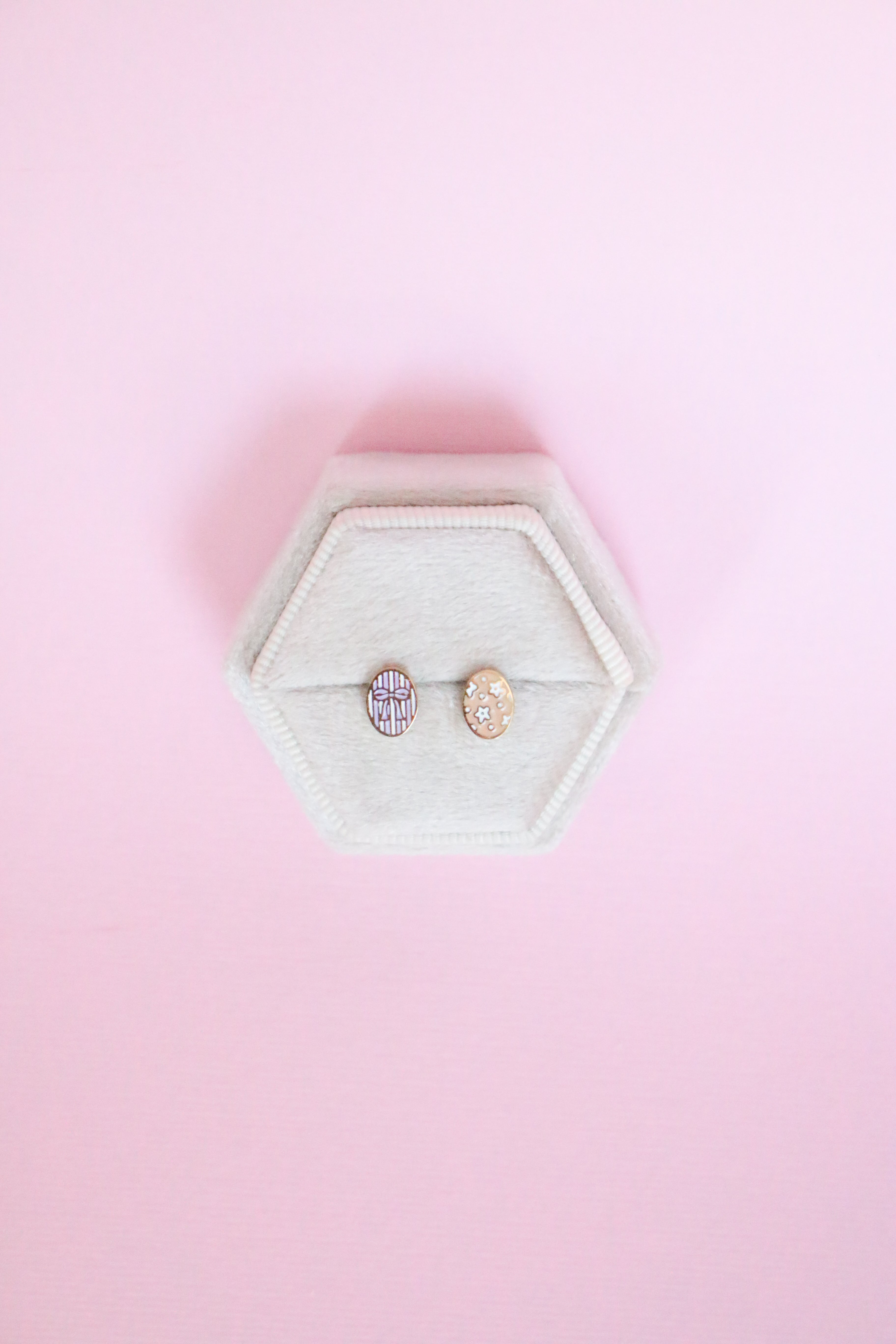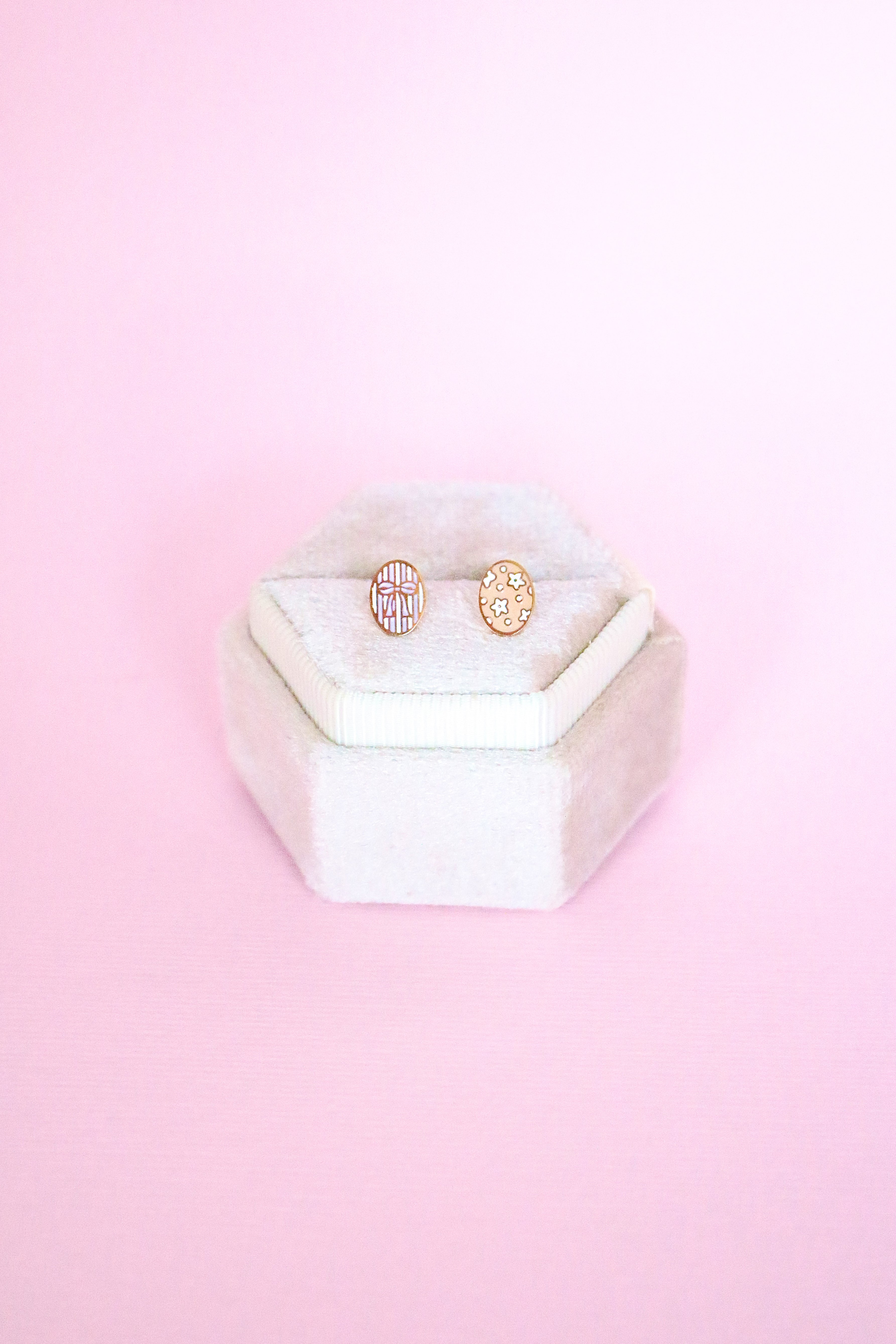 These cute mis-matched Easter Egg earrings are 18k gold plating and made from hypoallergenic materials, making them suitable for even the most sensitive ears. As part of our Easter collection these cute and dainty earrings are complemented by a flat back closure ensuring a comfortable and secure fit. One earring includes a cute pink and white stripe design adorned with a cute bow. The other egg features a soft peachy pink with cute flowers and polka dots. Add this cute custom design to your stack now.