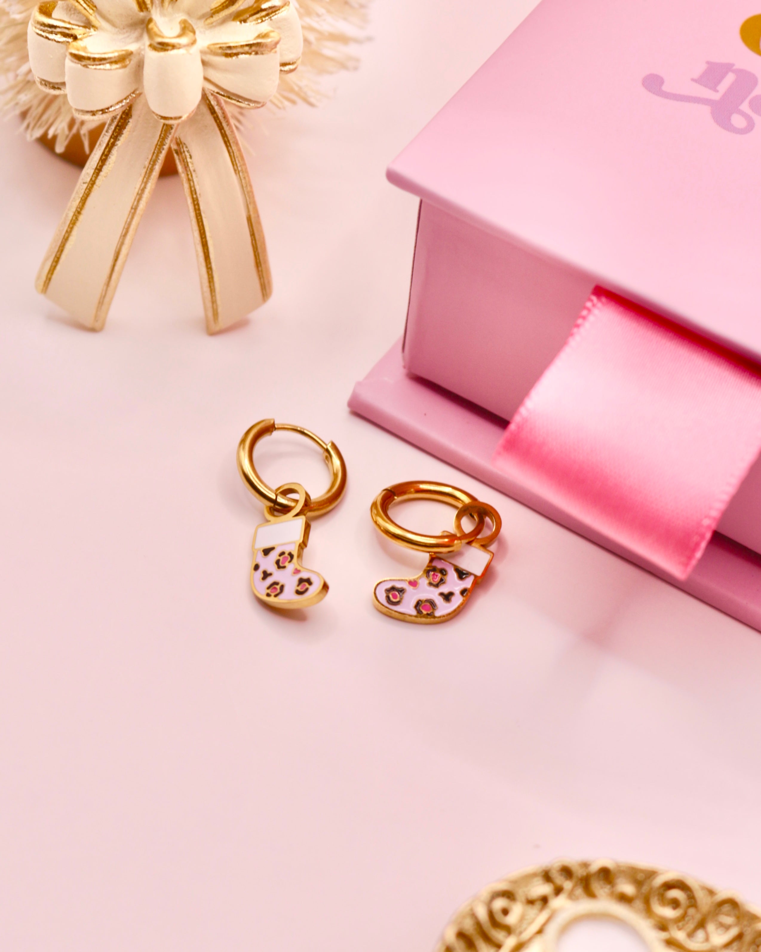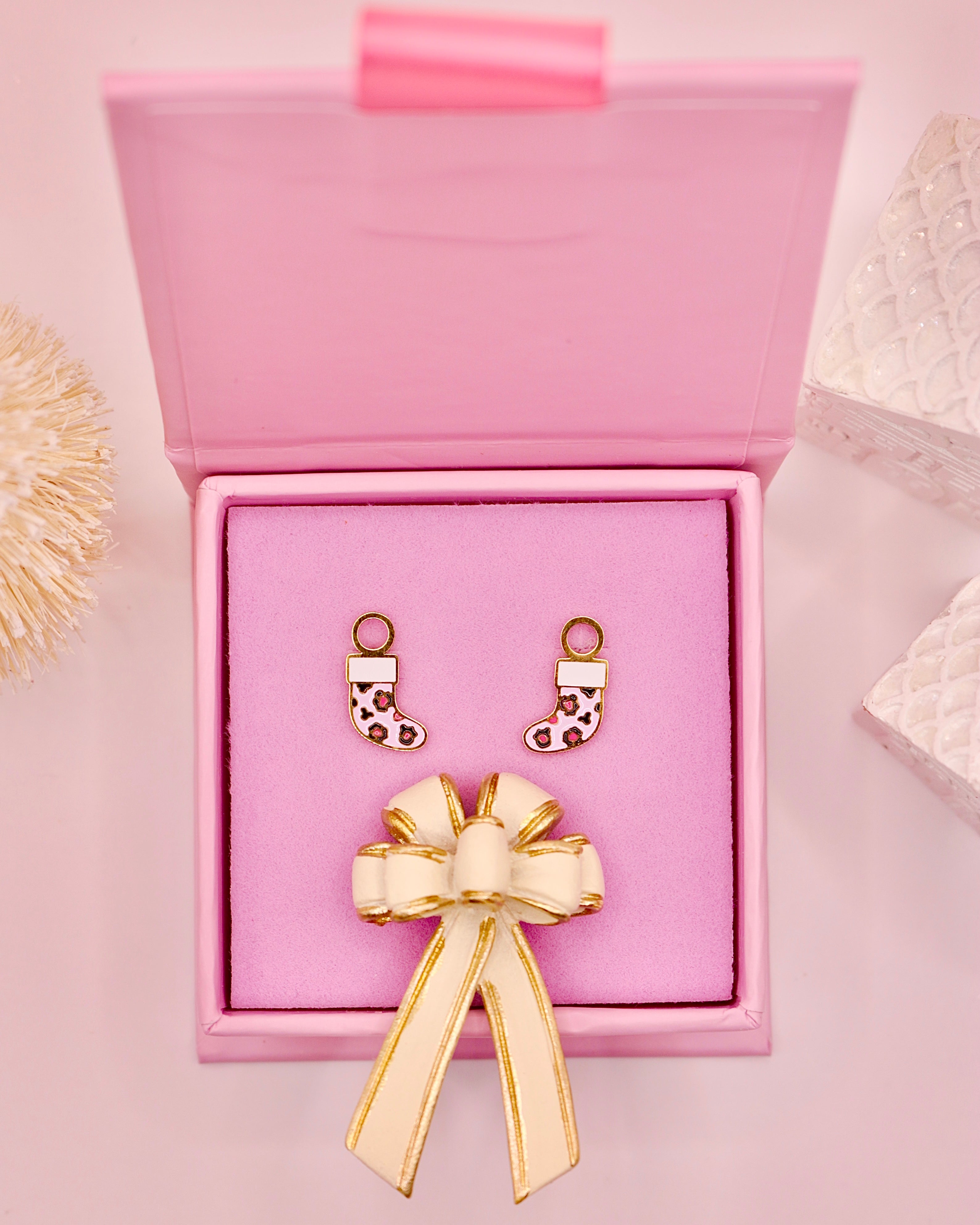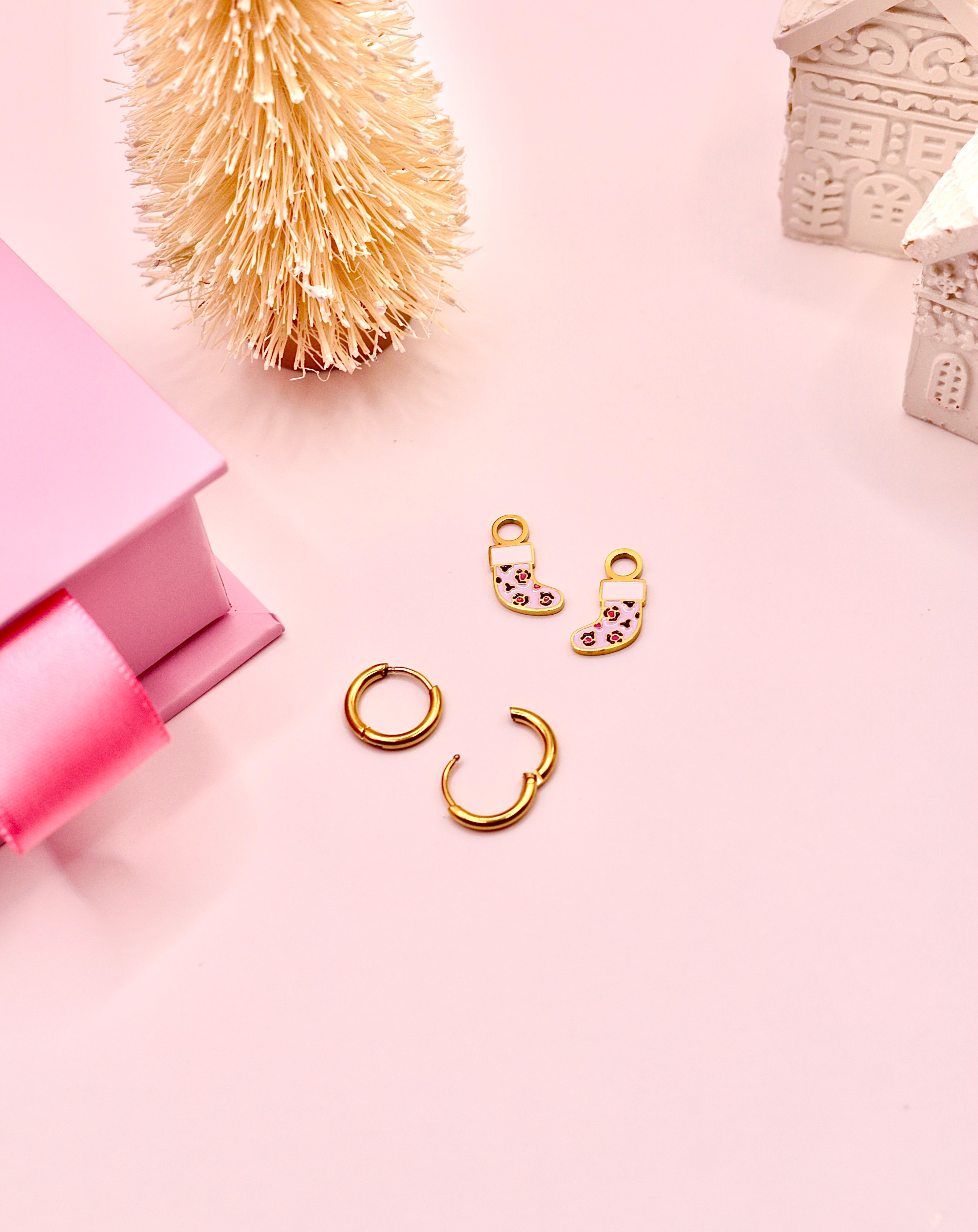 These cute pink cheetah print stocking charmss are 18k gold plated and made from hypoallergenic materials, making them suitable for even the most sensitive ears. They feature a cheetah print for a fun Holiday addition. These cute charms are perfect for the season. Add this cute custom design to your collection now!