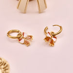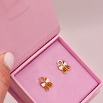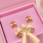 These cute bow charms are 18k gold plated and made from hypoallergenic materials, making them suitable for even the most sensitive ears. They feature a light pink bow with red and gold accents. Their cute and dainty appearance is a perfect pair with out gold huggies. Add this cute custom design to your collection now!