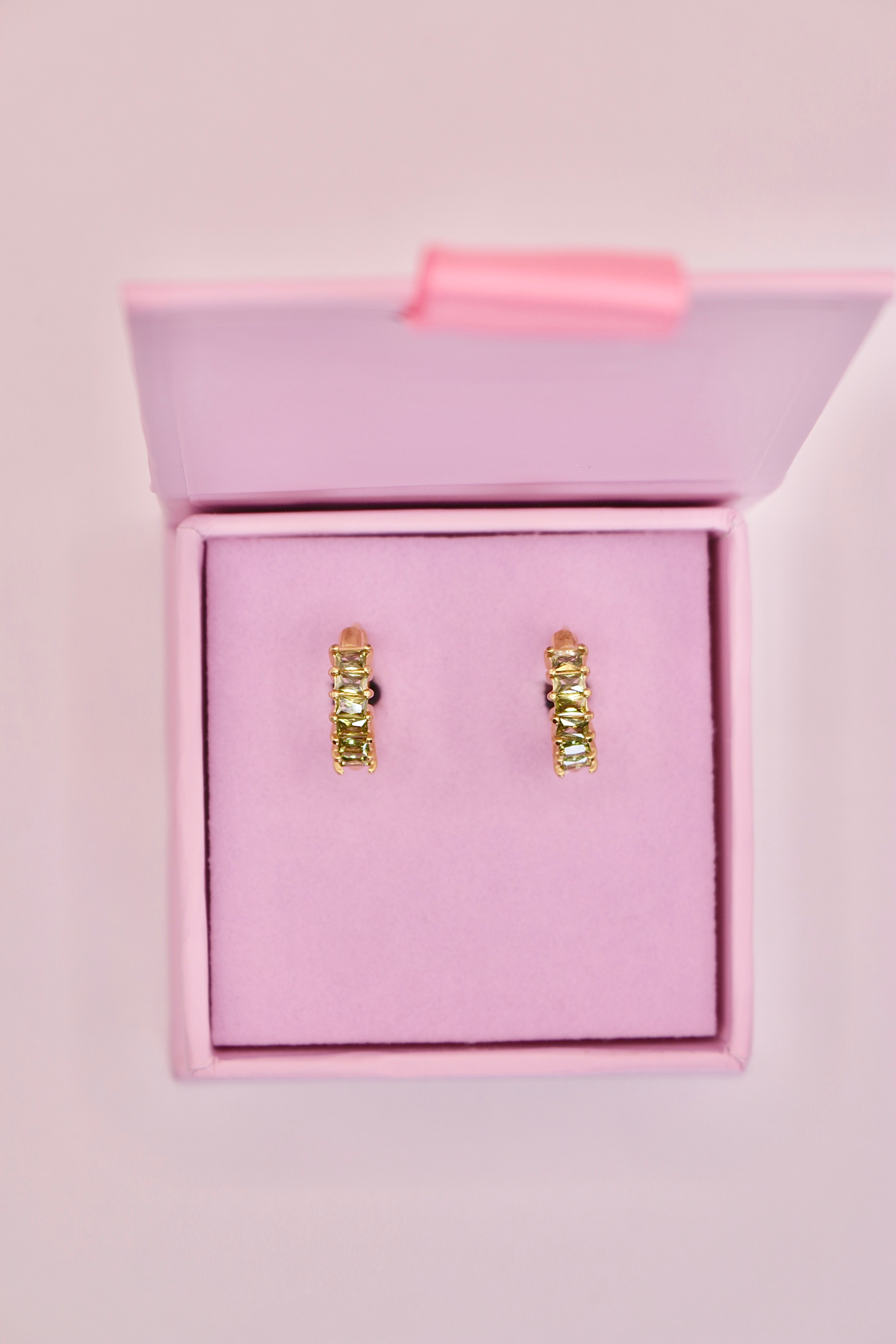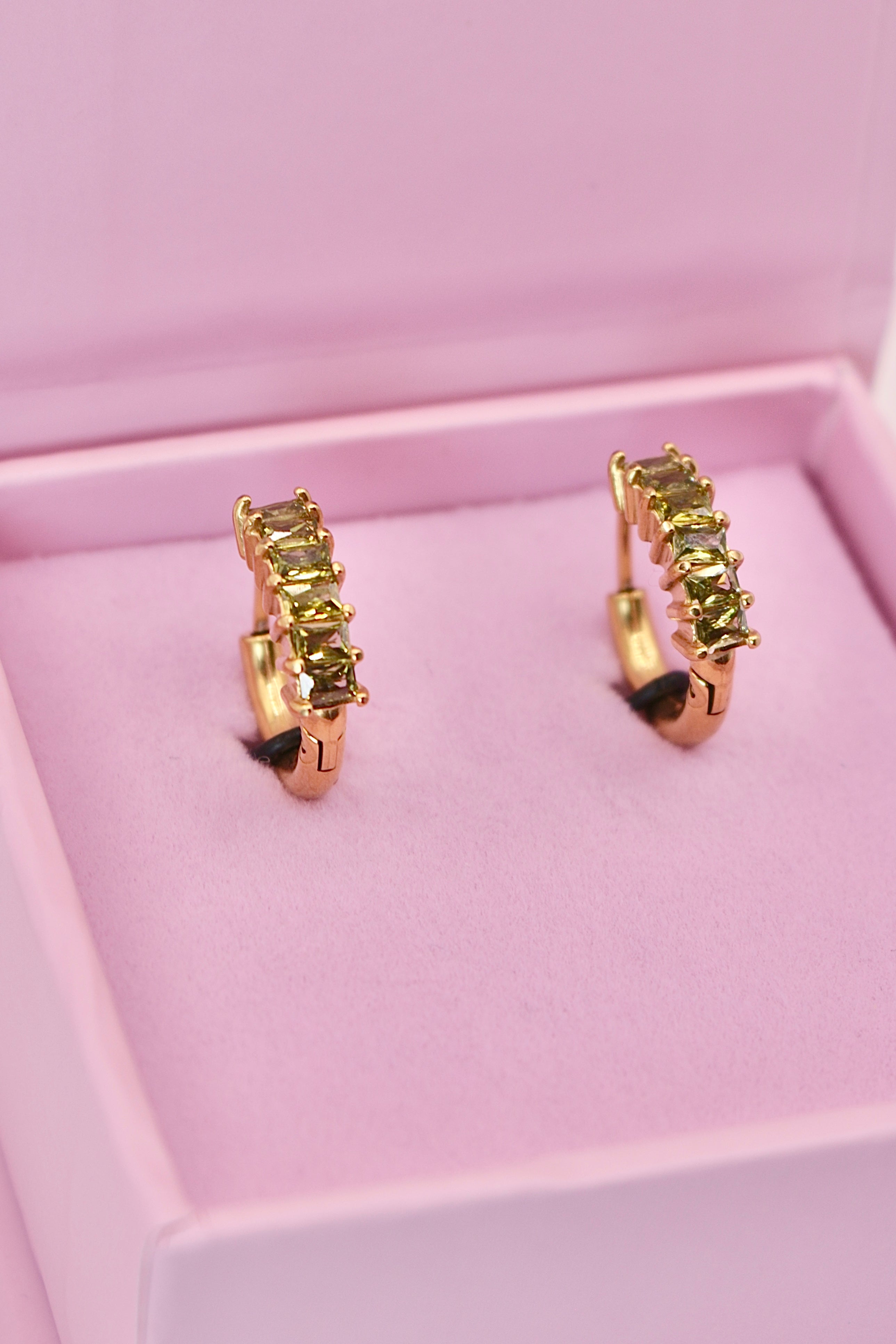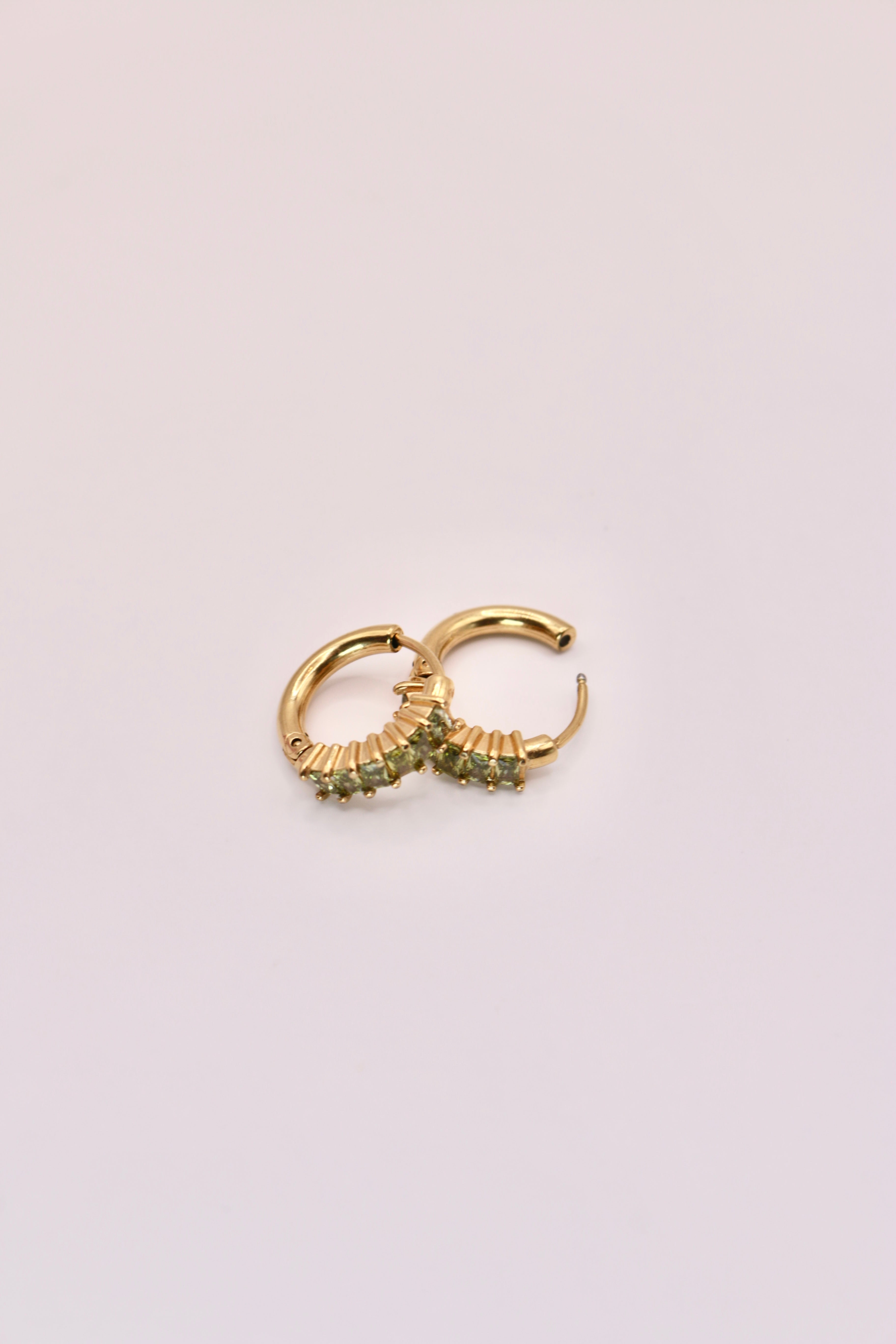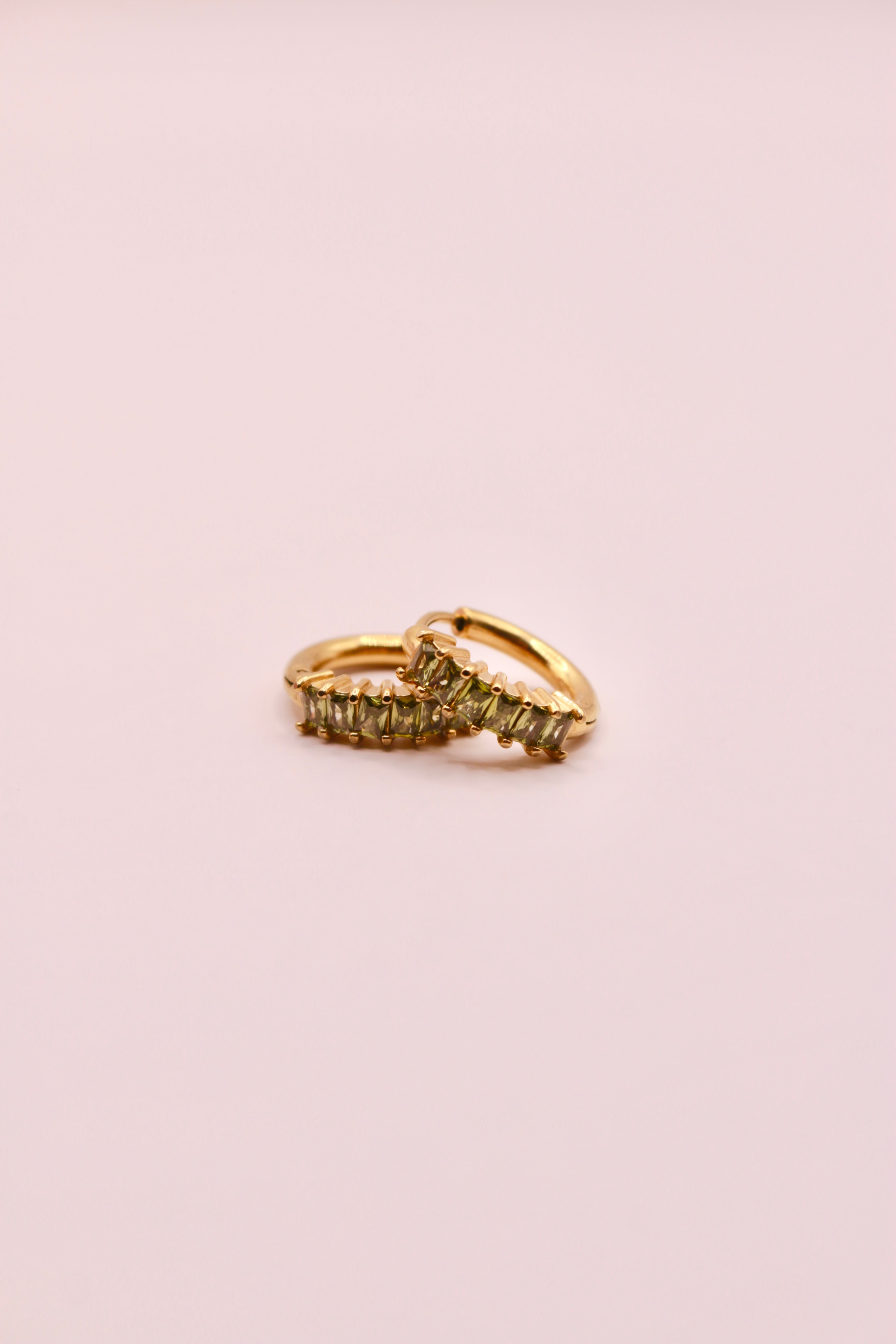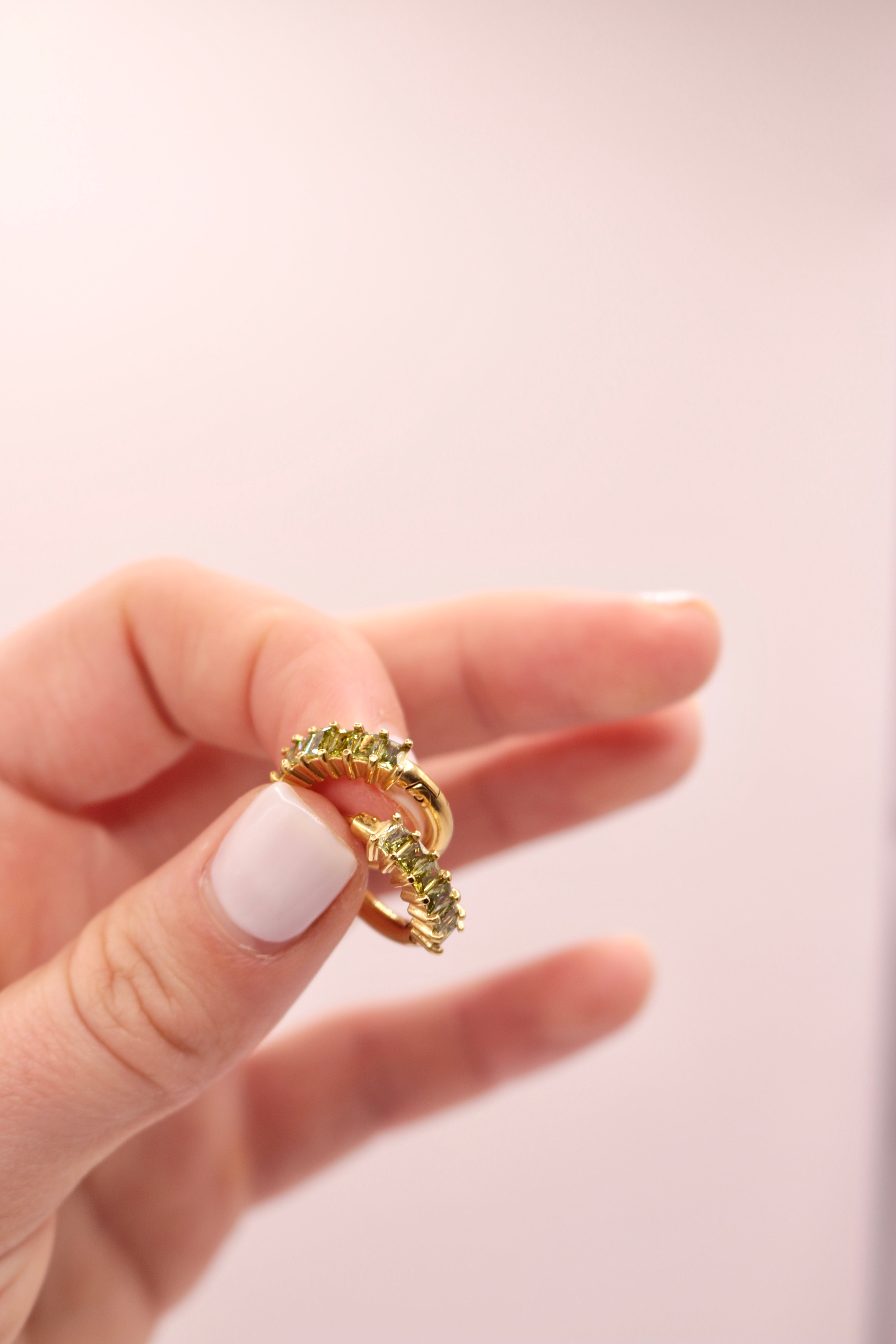 These emerald gem studded hoop earrings are 18k gold plated for quality you can trust, water resistant and tarnish free! Where these in the tub, at the pool or to work out! These were made to live in. Perfect for girls and women of all ages. Upgrade your accessory game with these stylish and functional earrings, perfect for all-day wear.