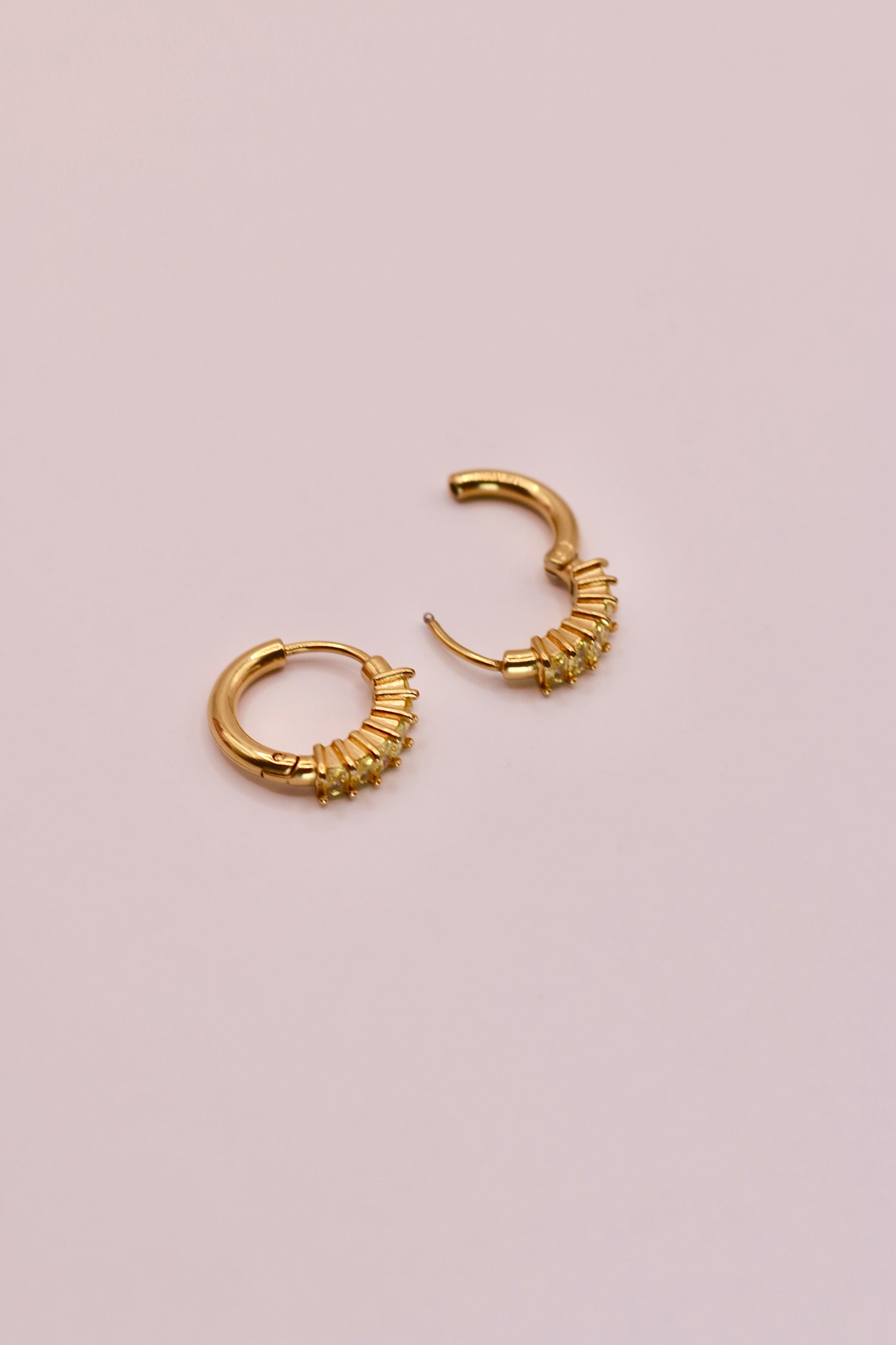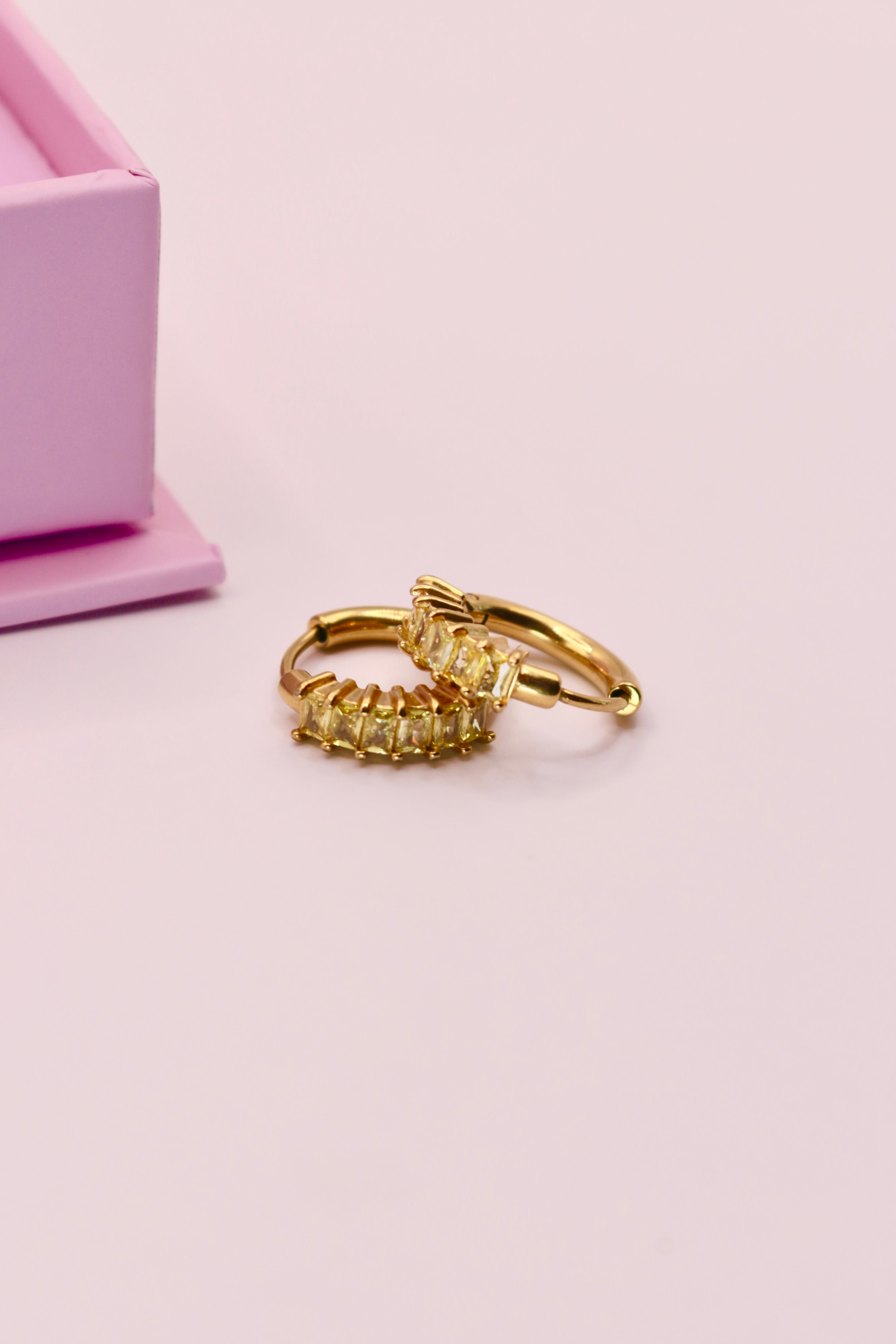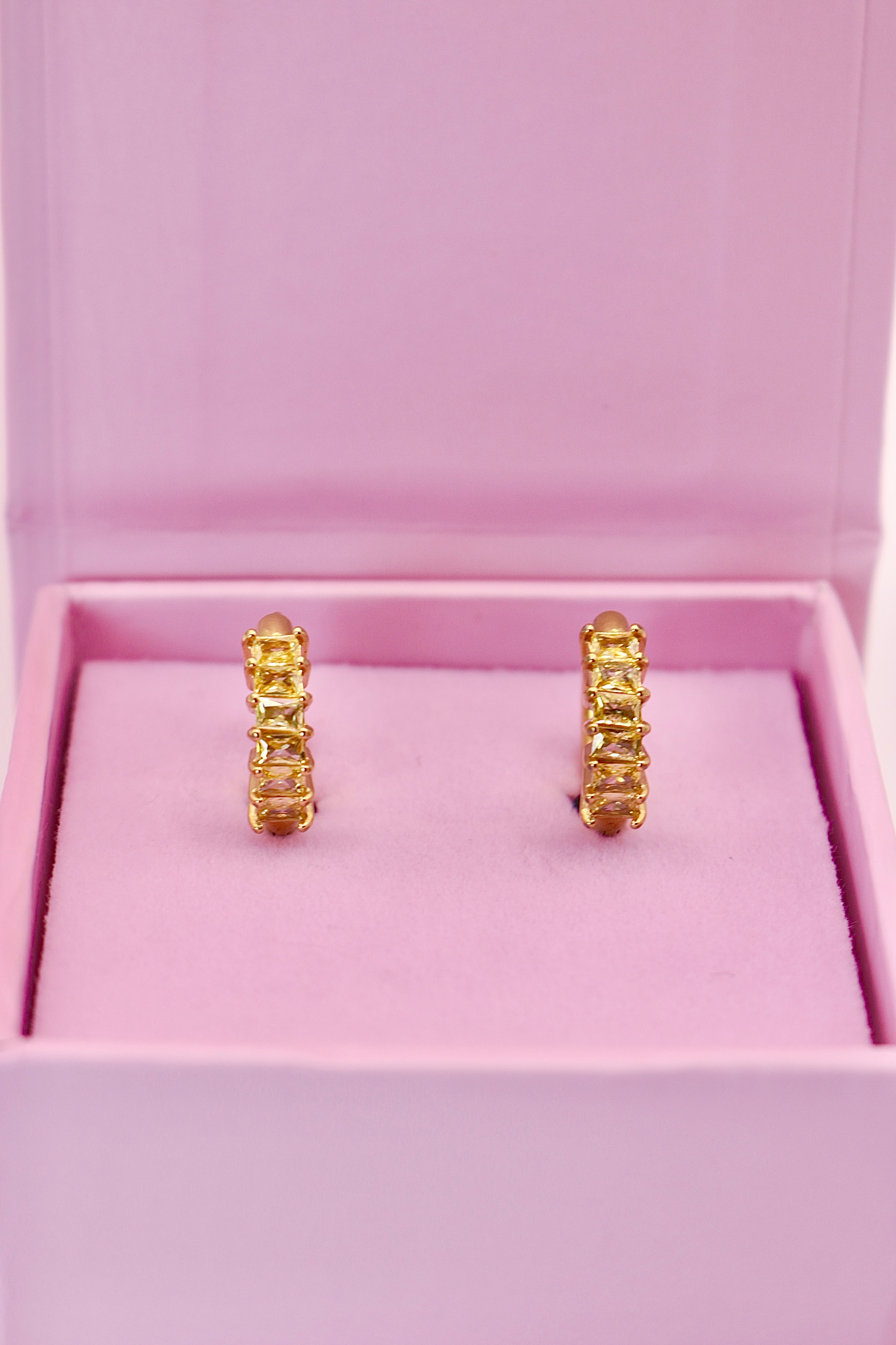 These yellow gem studded hoop earrings are 18k gold plated for quality you can trust, water resistant and tarnish free! Where these in the tub, at the pool or to work out! These were made to live in. Perfect for girls and women of all ages. Upgrade your accessory game with these stylish and functional earrings, perfect for all-day wear.