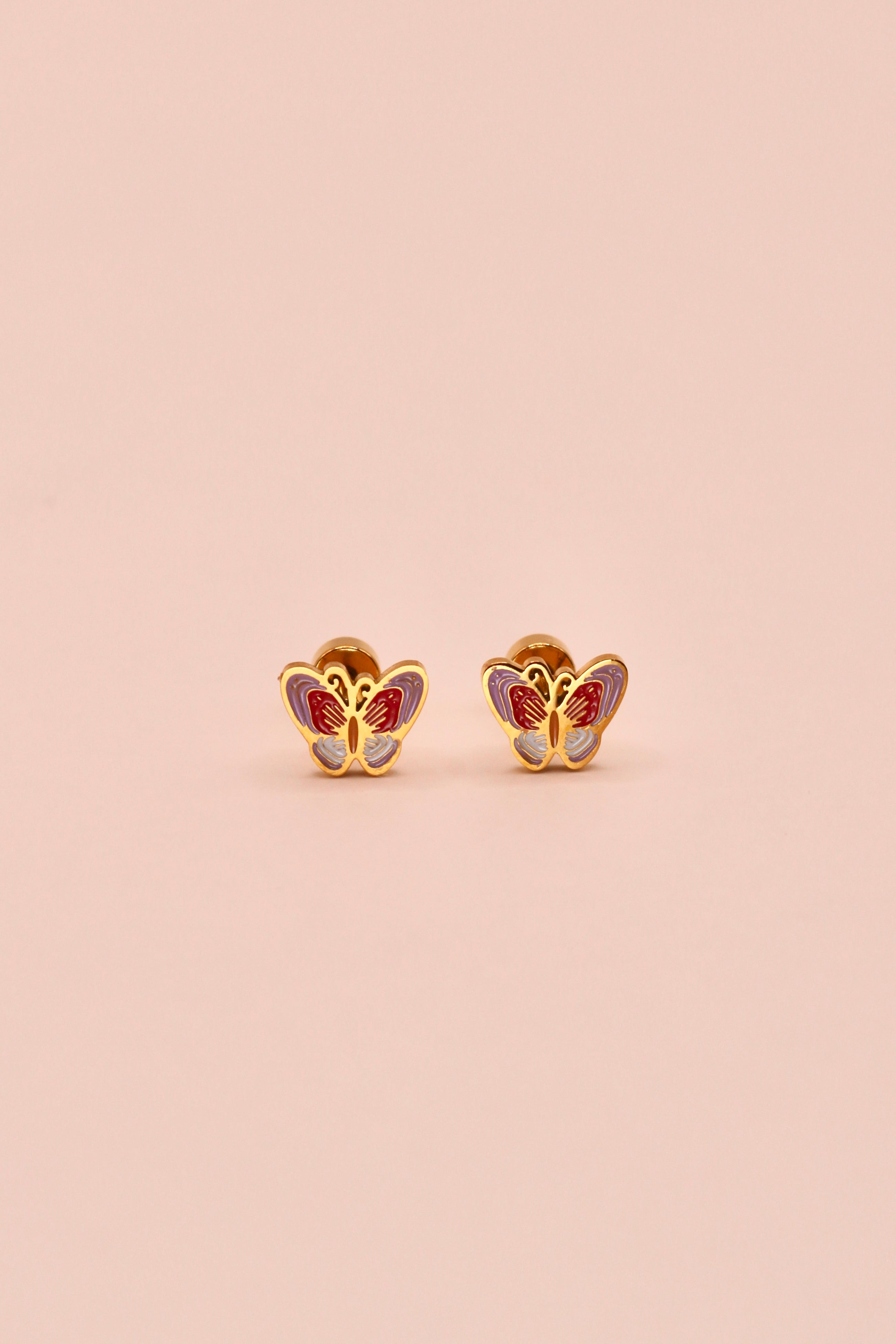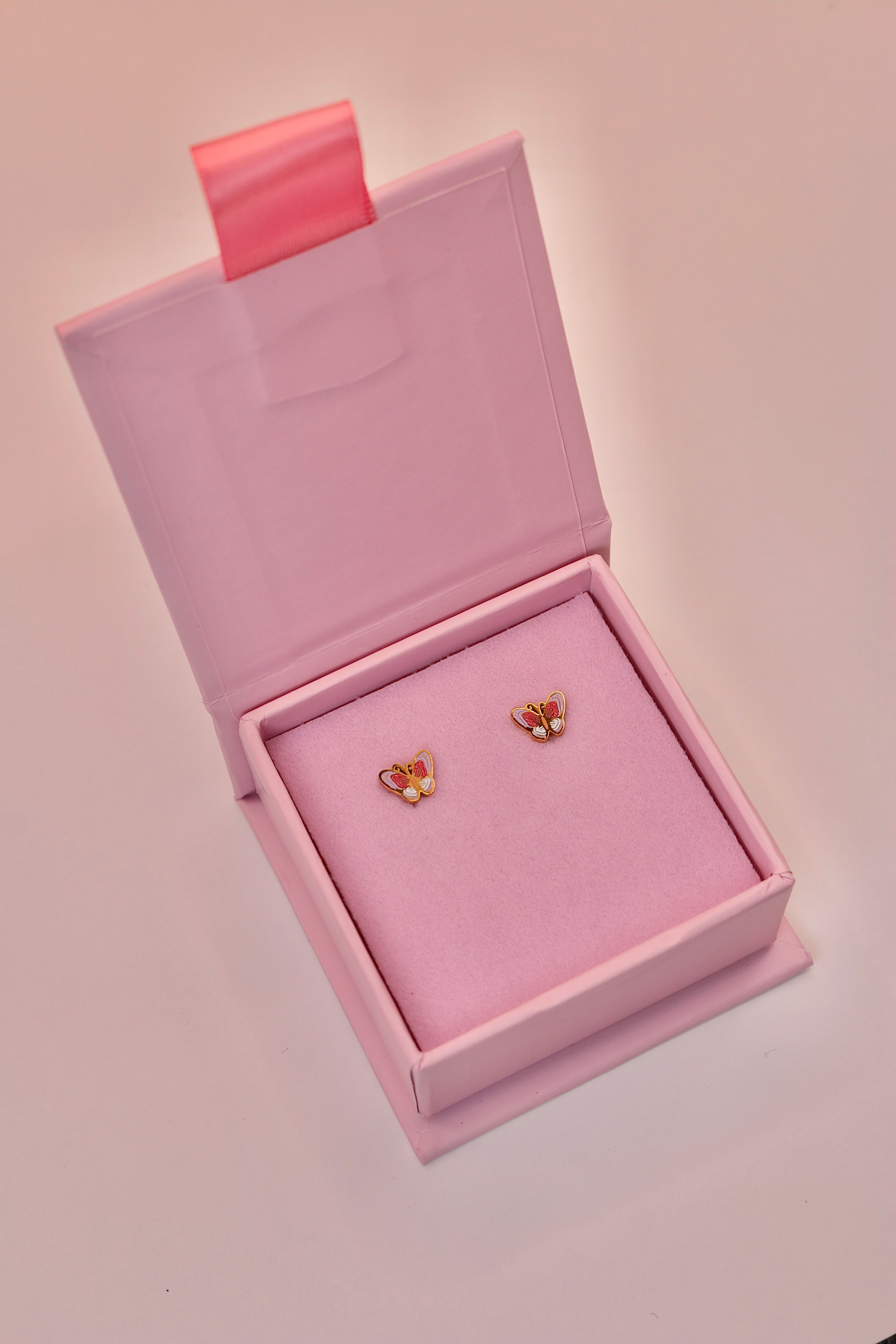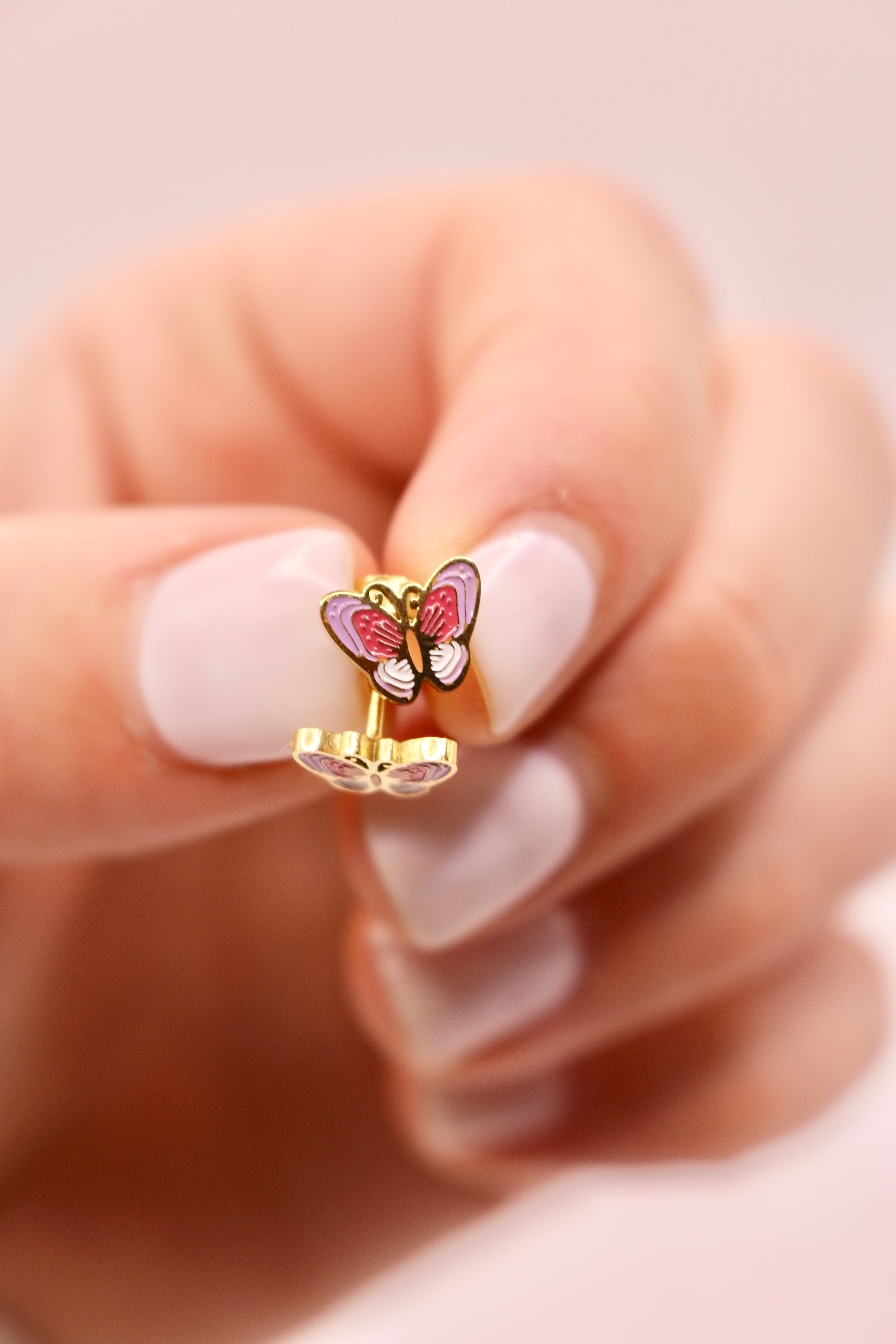 These cute butterfly earrings are 18k gold plated and made from hypoallergenic materials, making them suitable for even the most sensitive ears. They feature light pink wings with red and gold details. Their cute and dainty appearance is complemented by a flat back closure, ensuring a comfortable and secure fit. Add this cute custom design to your collection now!
