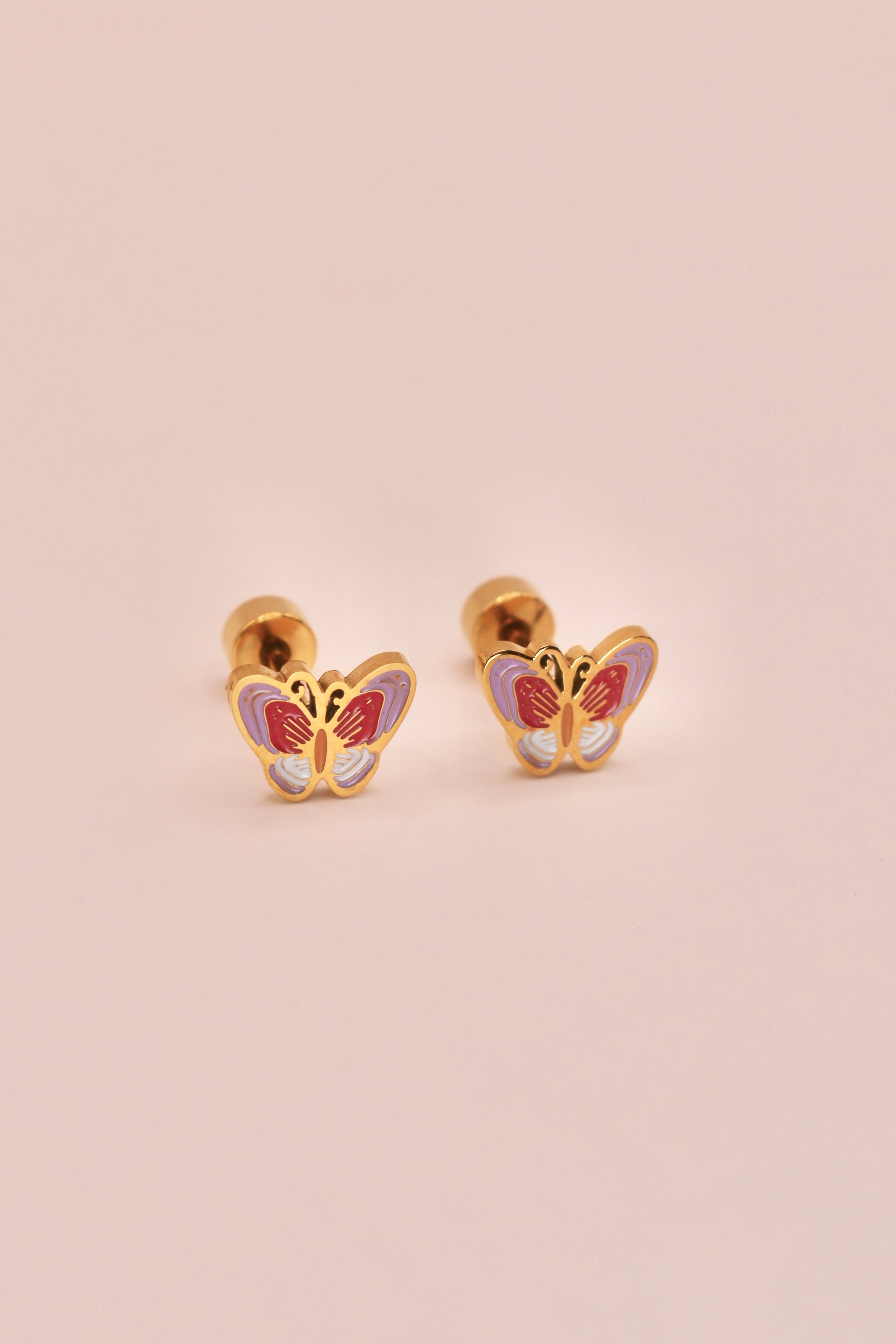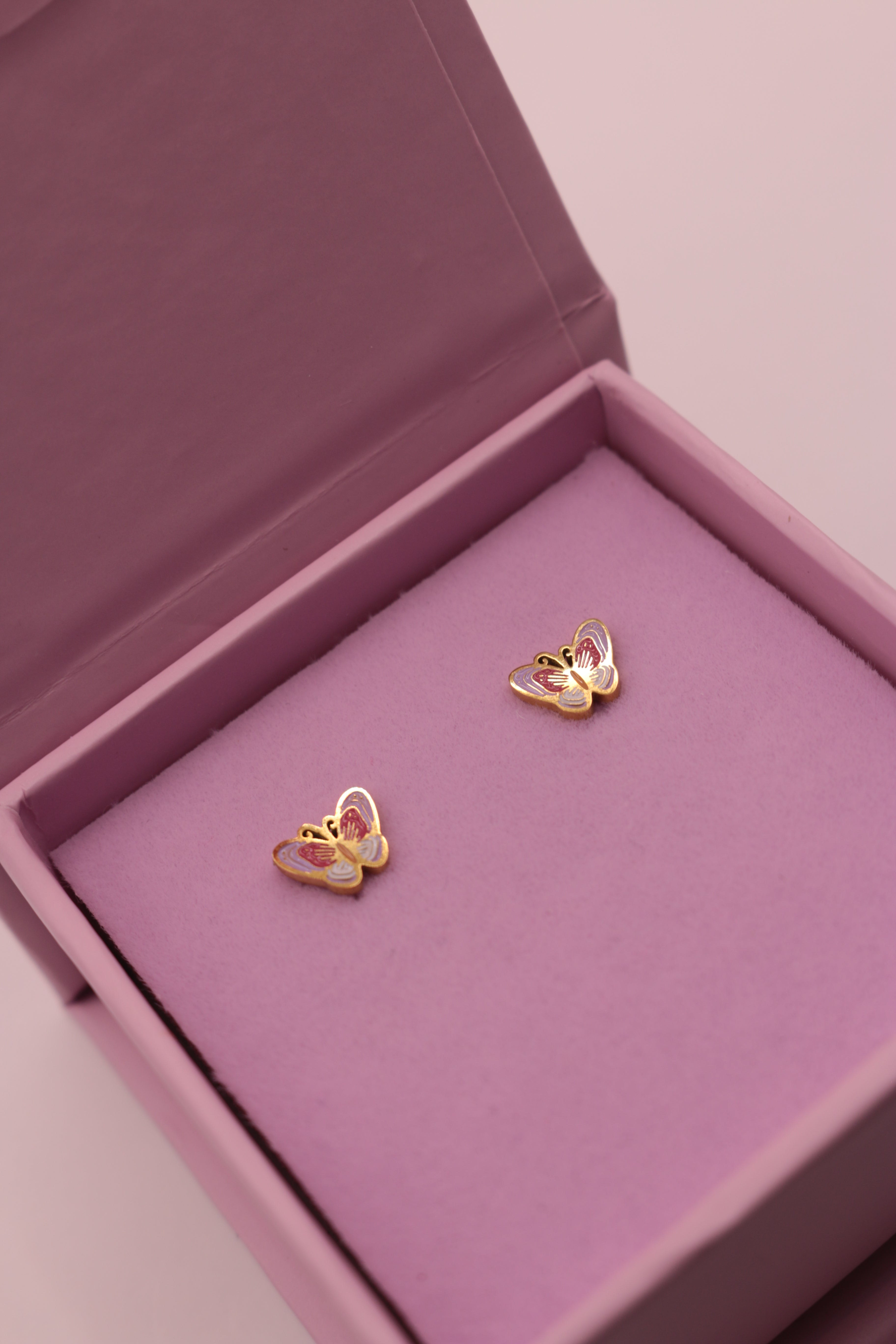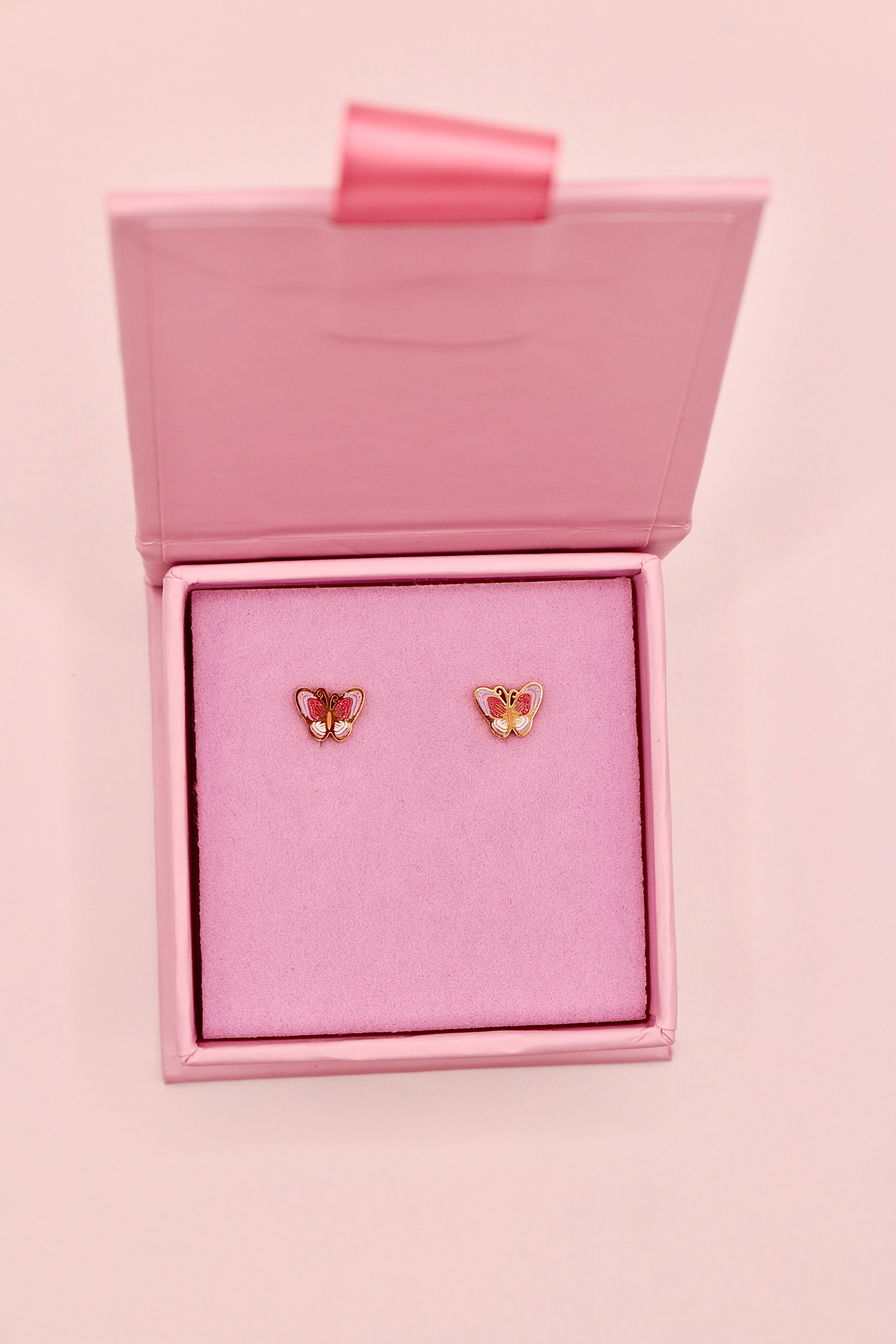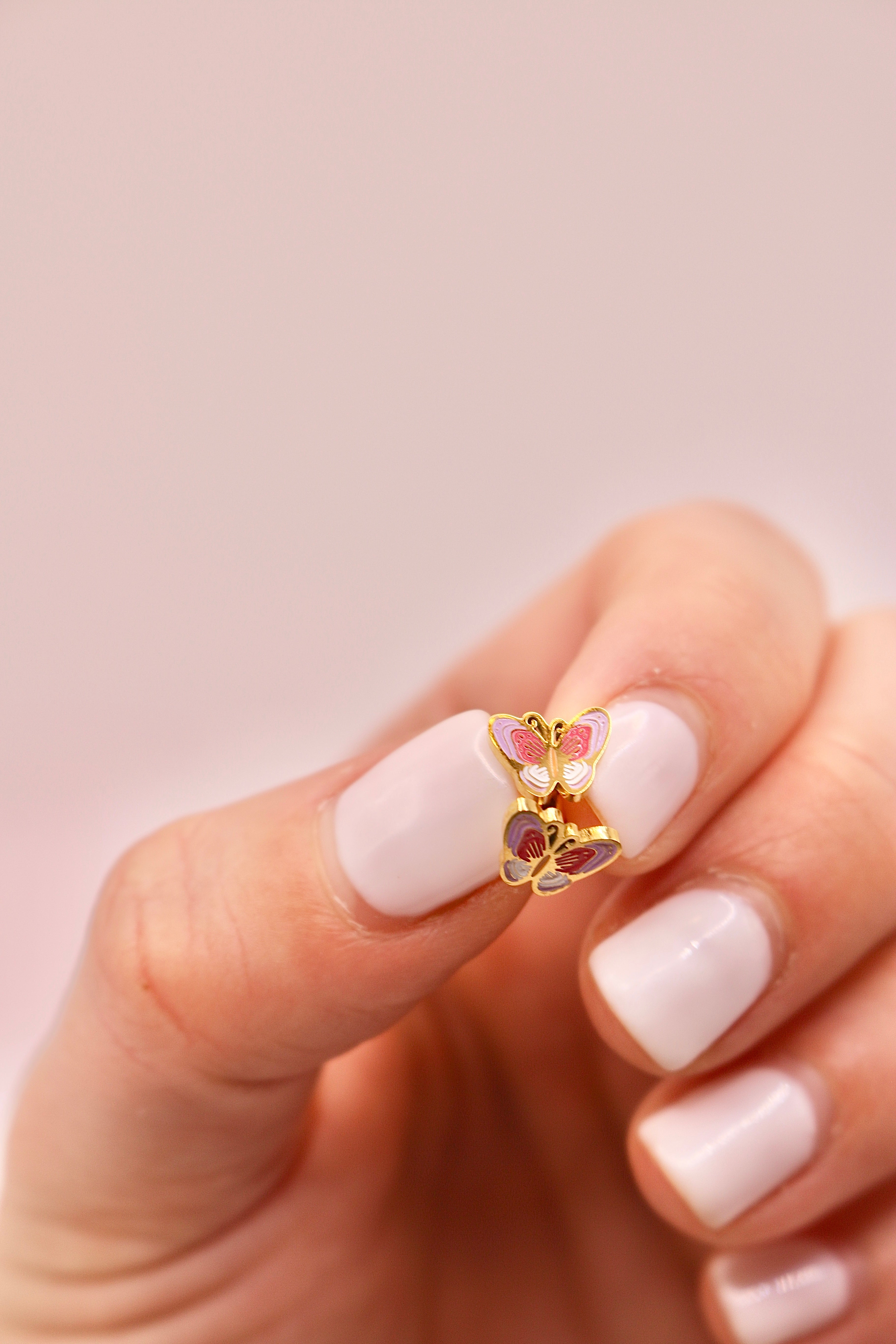 These cute butterfly earrings are 18k gold plated and made from hypoallergenic materials, making them suitable for even the most sensitive ears. They feature light pink wings with red and gold details. Their cute and dainty appearance is complemented by a flat back closure, ensuring a comfortable and secure fit. Add this cute custom design to your collection now!